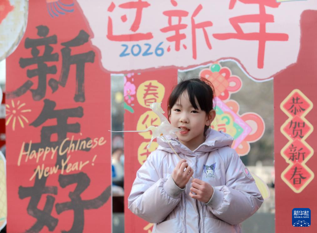 2月4日,在江苏省扬州市锦旺社区“非遗迎新春”市集活动中,一名小朋友在品尝糖人。新华社发(孟德龙摄)