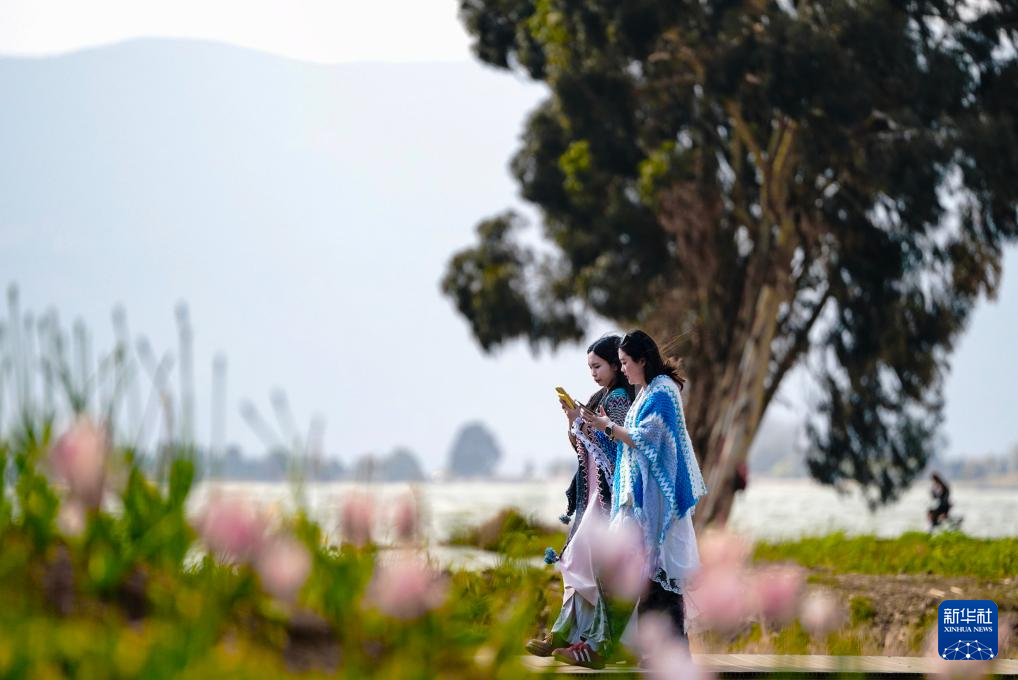 2月26日,两名游客在滇池边拍照打卡。新华社记者 陈欣波 摄