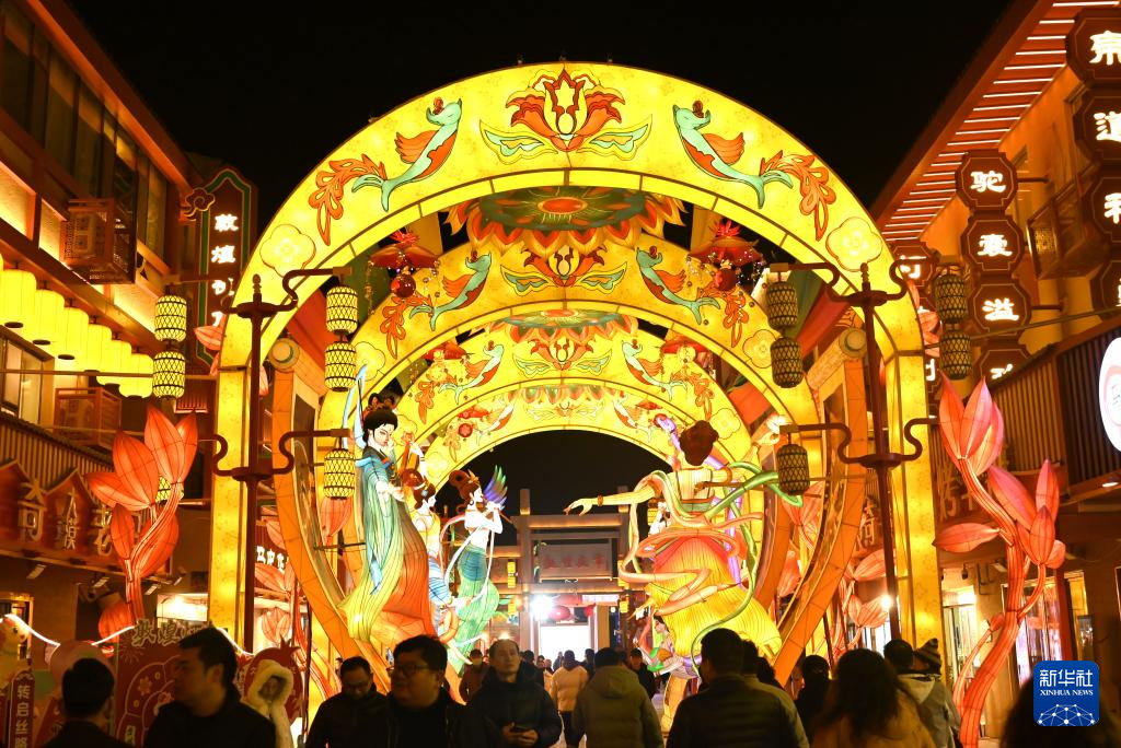 3月1日,人们在甘肃省敦煌夜市举办的敦煌灯会上观赏花灯。新华社发(张晓亮摄)