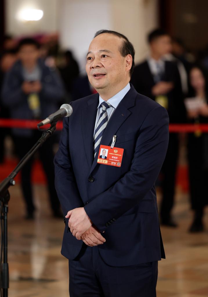 3月4日,全国政协十四届四次会议首场“委员通道”集体采访活动在北京人民大会堂举行。这是全国政协委员曾毓群接受媒体采访。新华社记者 卢烨 摄