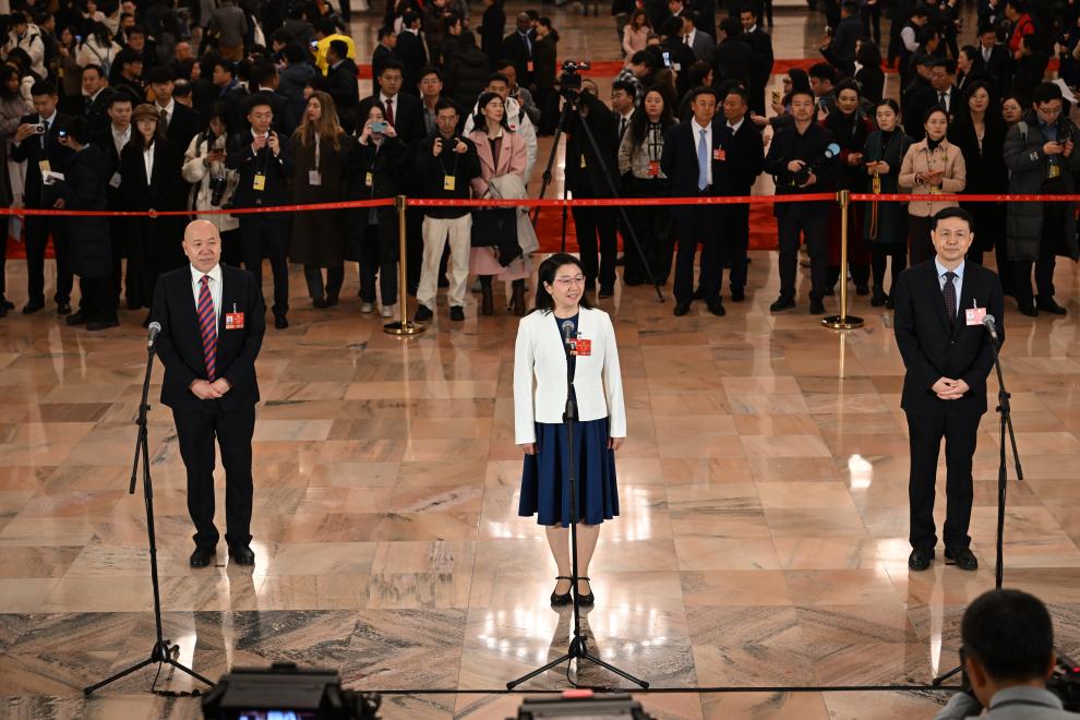 3月4日,全国政协十四届四次会议首场“委员通道”集体采访活动在北京人民大会堂举行。新华社记者 曹祎铭 摄