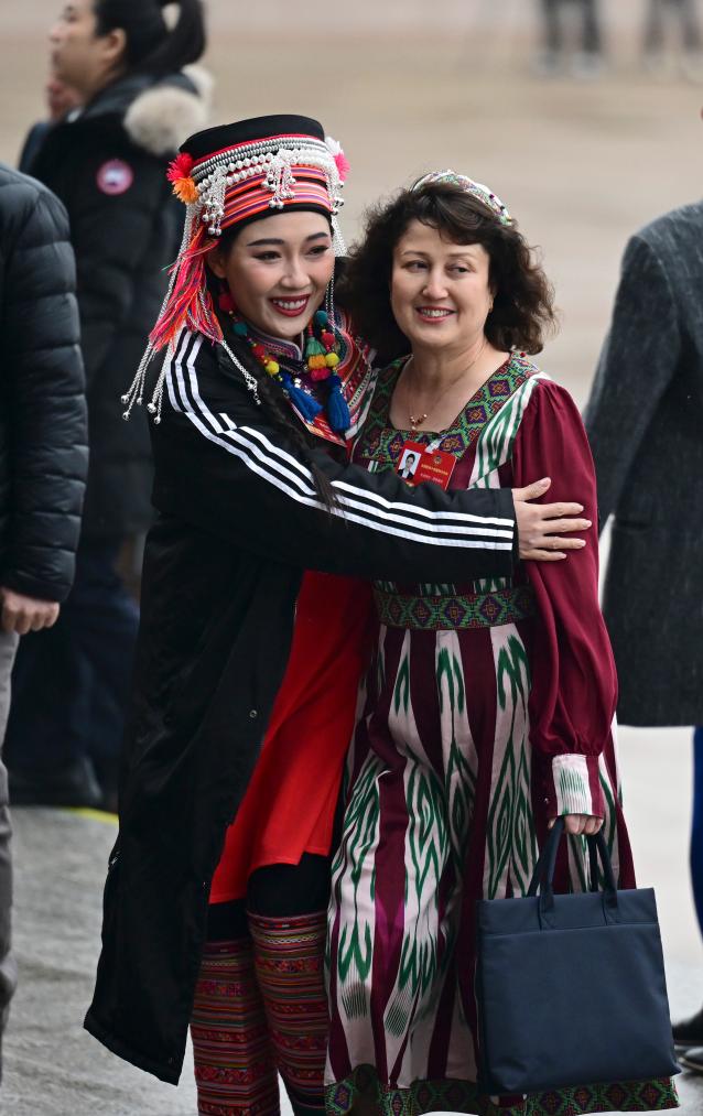 3月4日,中国人民政治协商会议第十四届全国委员会第四次会议在北京人民大会堂开幕。这是杨钰尼委员(左)与木合拜尔·阿布都尔委员一起步入会场。新华社记者 陈晔华 摄