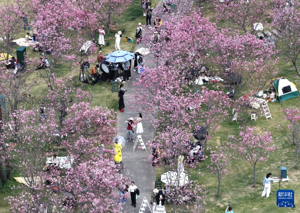 3月14日,市民在广西南宁市青秀山风景区樱花园赏花(无人机照片)。新华社记者 周华 摄