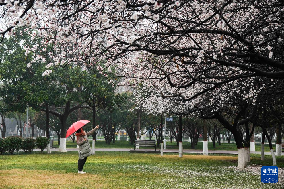 3月14日,在河南省济源市世纪广场,市民冒雨赏花。新华社发(苗秋闹 摄)