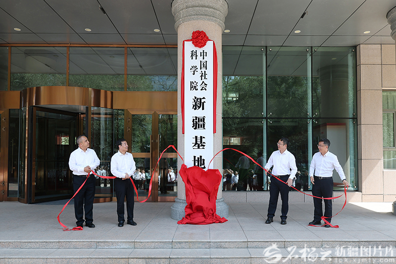 9月8日,自治区党委书记陈小江,中国社会科学院院长、党组书记高翔,自治区党委副书记、自治区主席艾尔肯·吐尼亚孜,中国社科院副院长赵芮为中国社会科学院新疆基地揭牌。天山网-新疆日报记者 崔志坚摄