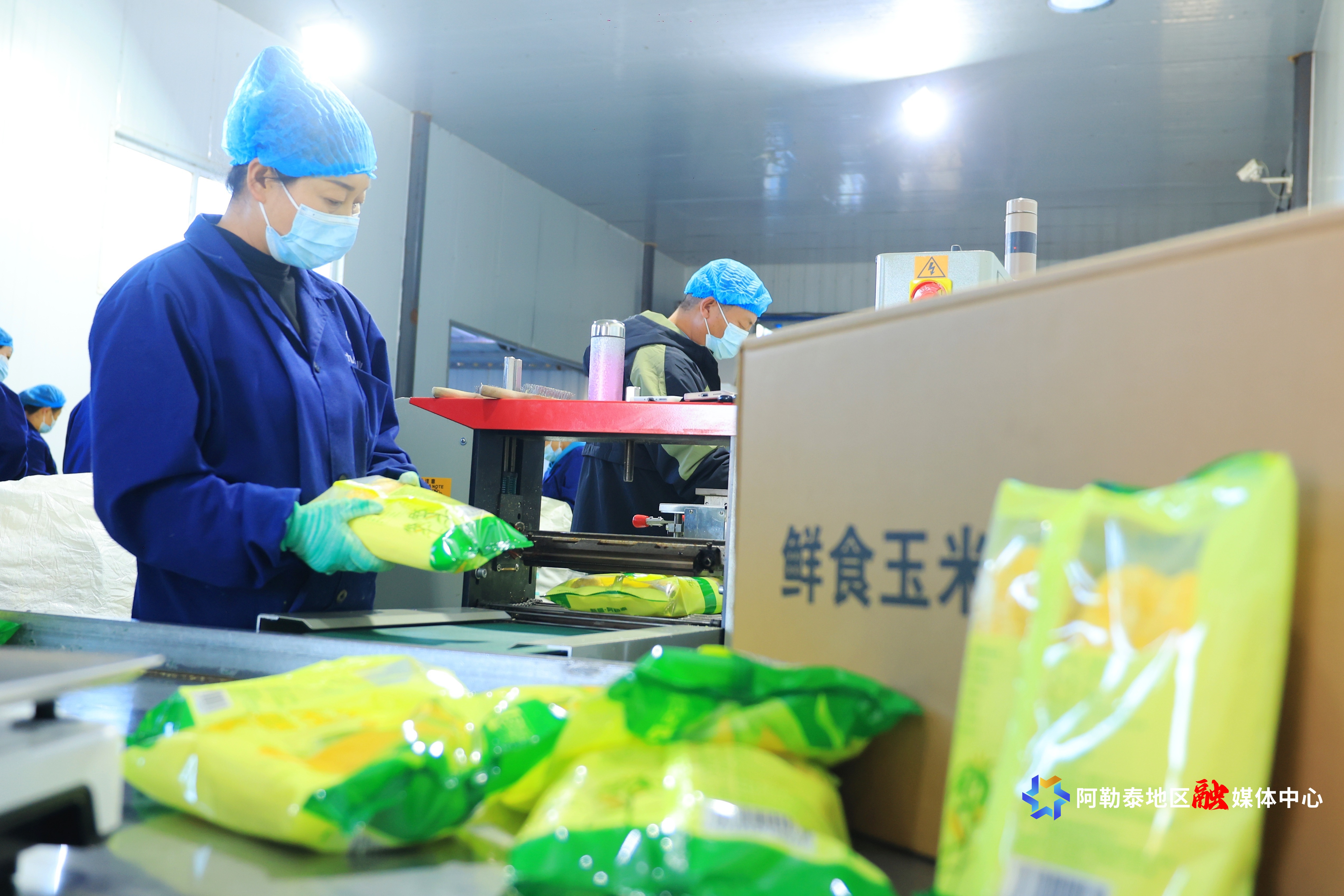 阿勒泰新闻网-阿勒泰地区融媒体中心(记者 阿尔达克·拜斯汗)9月16日,福海县喀拉玛盖镇九州农业发展有限公司职工在生产车间加工鲜食玉米。近年来,福海县进一步延伸鲜食玉米种植、加工产业链,推动传统玉米产业转型升级,让鲜食玉米成为村民增收致富的“香苞米”。