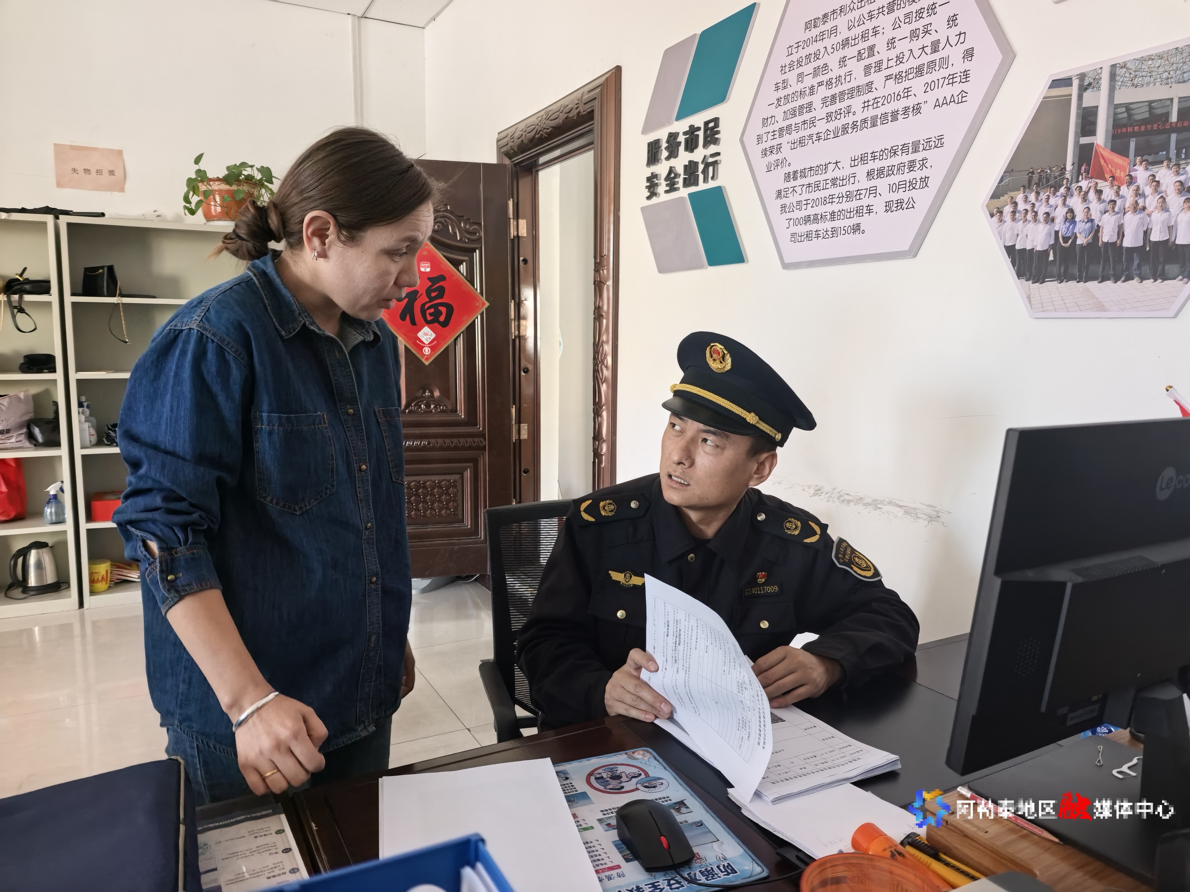 阿勒泰市利众公共交通有限公司里,执法人员与企业人员交流,了解安全生产相关情况。通讯员王瑞坤拍摄