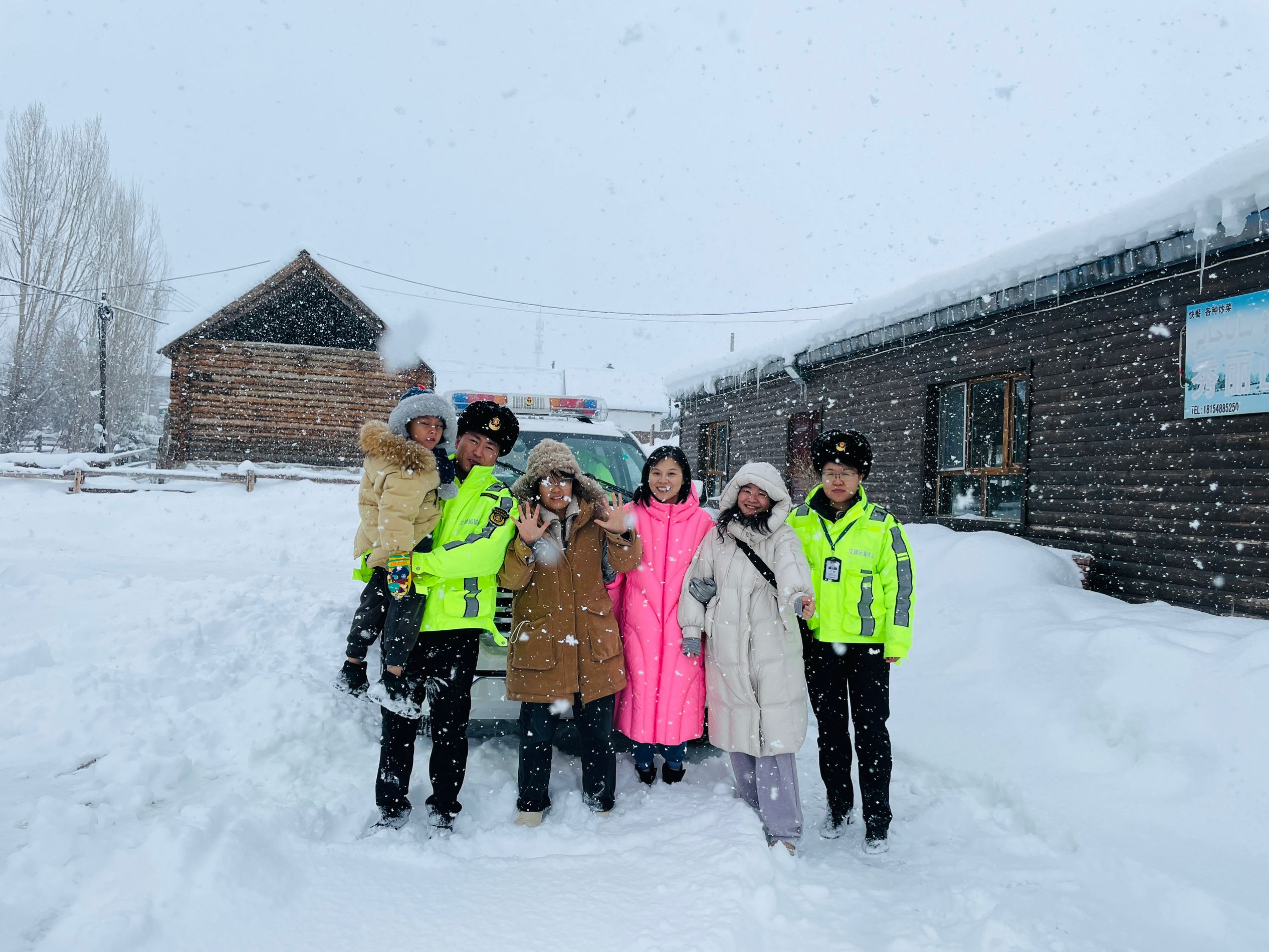 在G219线巡查途中发现游客车辆深陷雪窝,阿勒泰执法支队执法人员对车辆进行救援并将游客安置至安全地点。