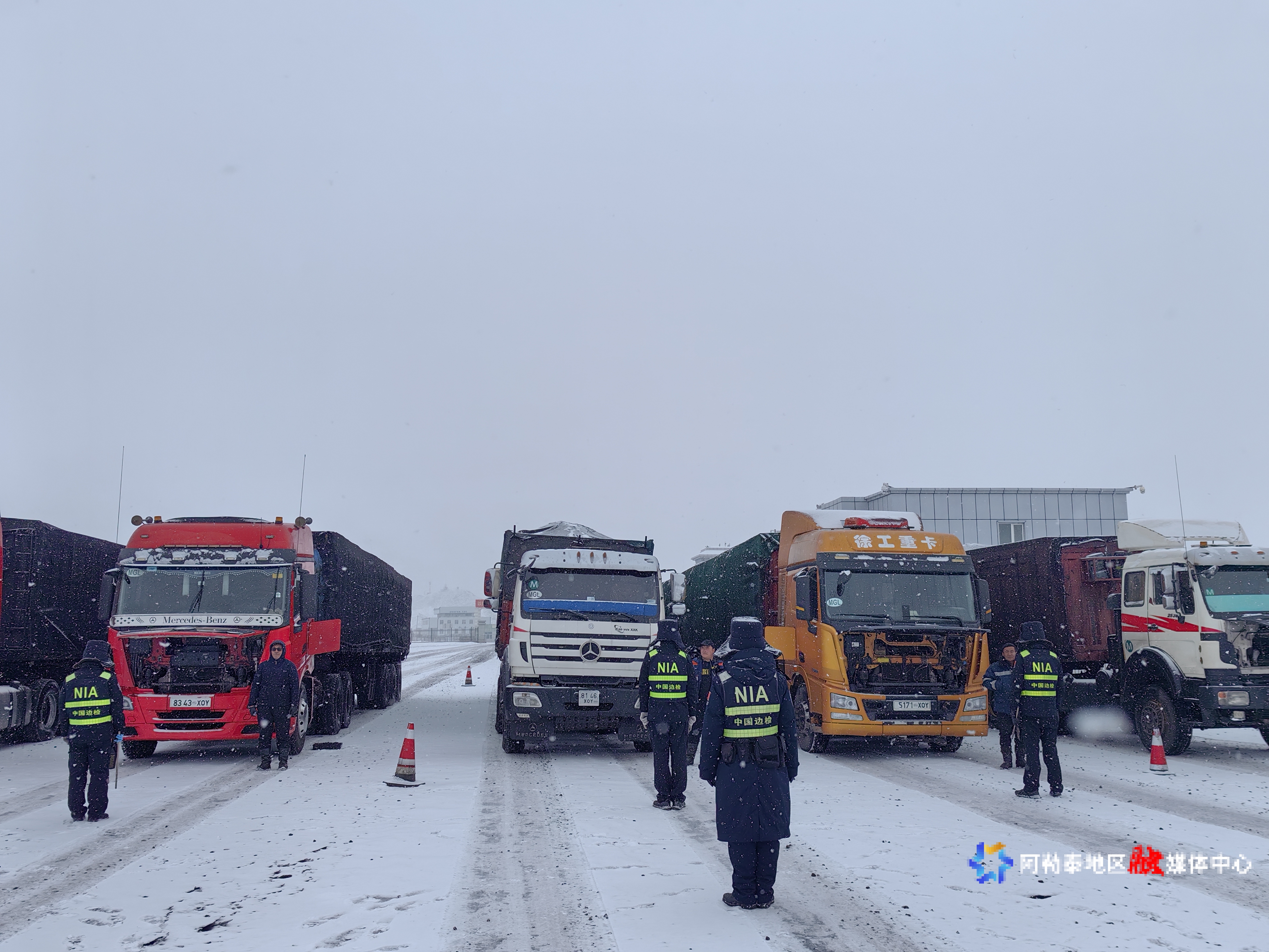 阿勒泰新闻网-阿勒泰地区融媒体中心(记者 朱马别克·卡德尔别克 通讯员 陈明俊 摄)11月22日,塔克什肯口岸迎来风雪天气,塔克什肯出入境边防检查站执勤民警始终坚守一线,全力确保能源运输通道安全畅通。