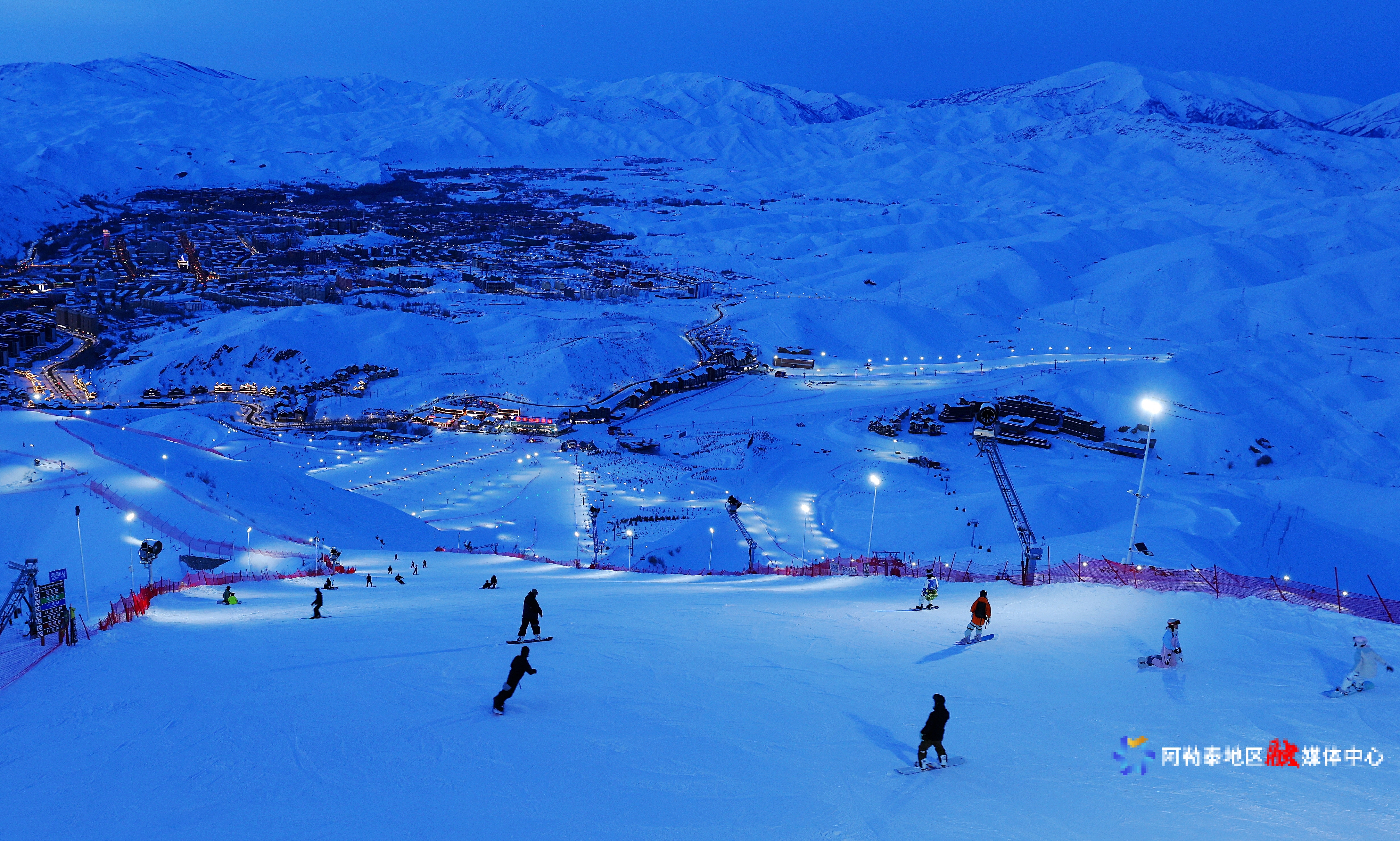 雪友在阿勒泰市将军山国际滑雪度假区夜场滑雪。