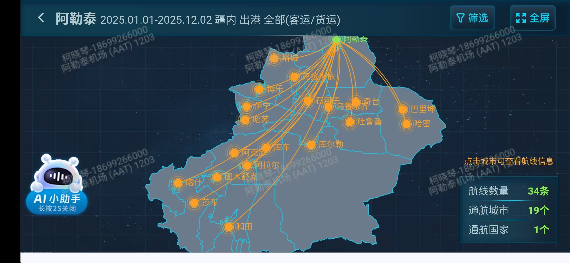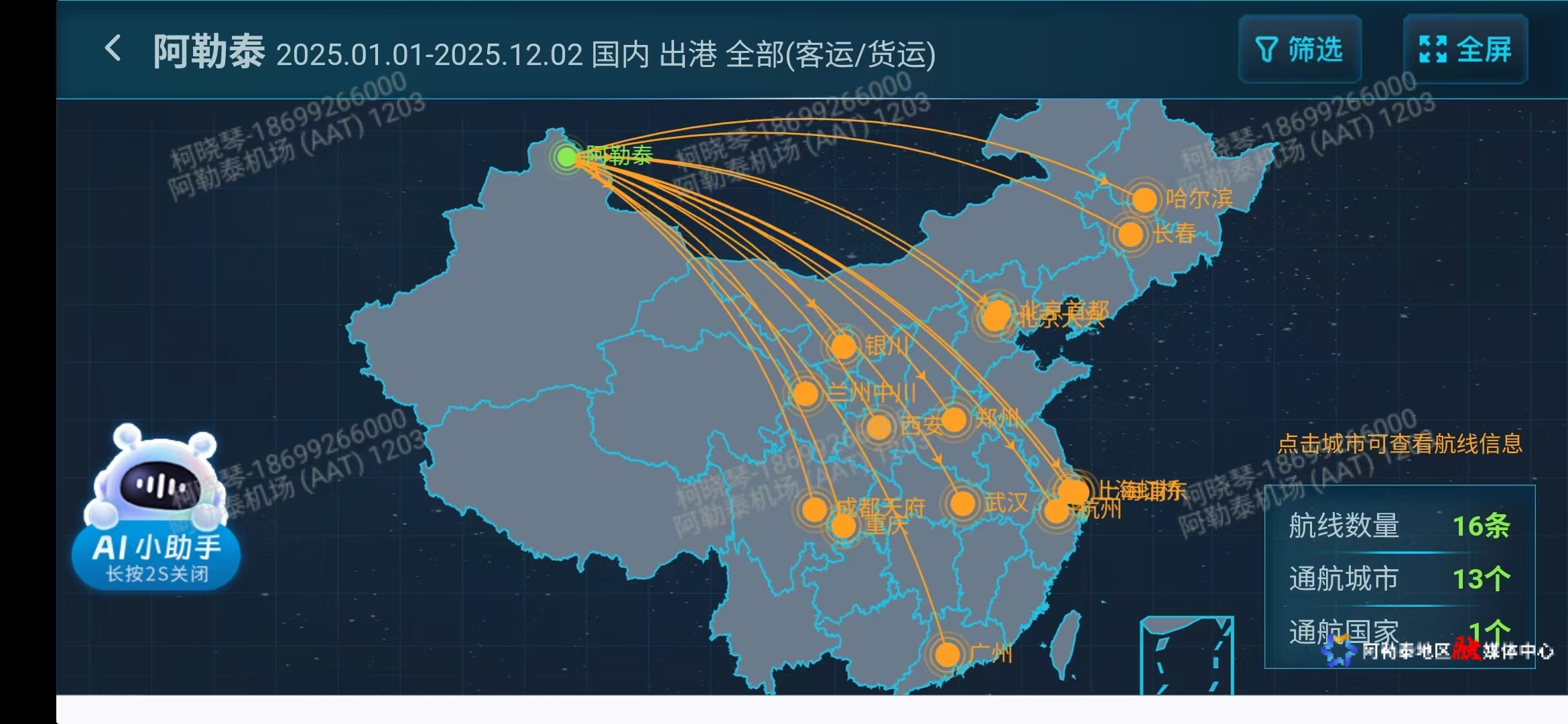 阿勒泰2025年1月1日至12月2日国内出港航线。阿勒泰雪都机场供图。