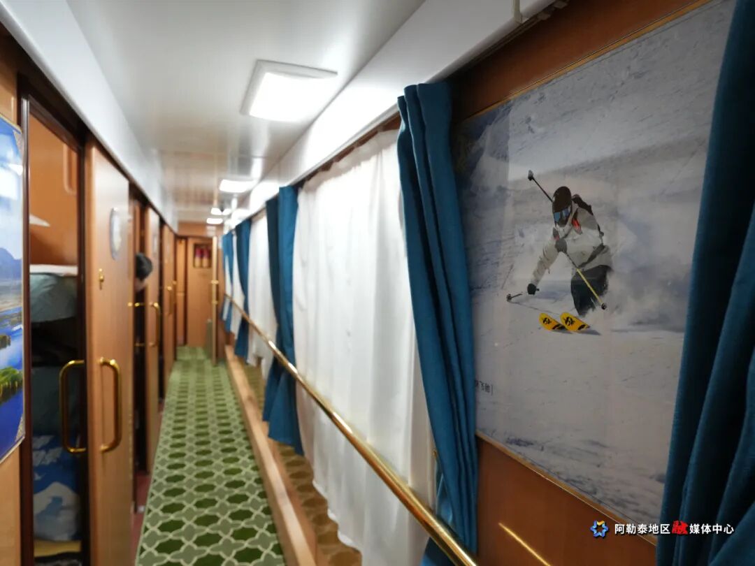 开行“中国雪都·我的阿勒泰”号快速旅客列车是新疆铁路部门助力文化旅游业高质量发展的又一有力举措。该趟列车紧扣冰雪主题,列车外观涂装以“中国雪都·我的阿勒泰”和山脉、滑雪运动图案组合而成,整体方案既突出了阿勒泰雪都的自然风貌,又彰显出新疆冰雪运动蓬勃的发展活力。车厢内采取“一车一景”设计,包厢名称均以阿勒泰地区著名风景区命名,车厢内悬挂阿勒泰地区自然风光、冰雪旅游以及著名滑雪场冰雪运动的镜框挂画,突显冰雪主题独特魅力,让旅客一上车就能感受到冰雪魅力以及浓郁的民俗文化。