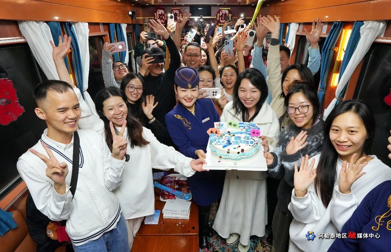 首趟“中国雪都·我的阿勒泰”号旅客列车的工作人员正与乘客举办跨年活动。通讯员 摆风亮摄