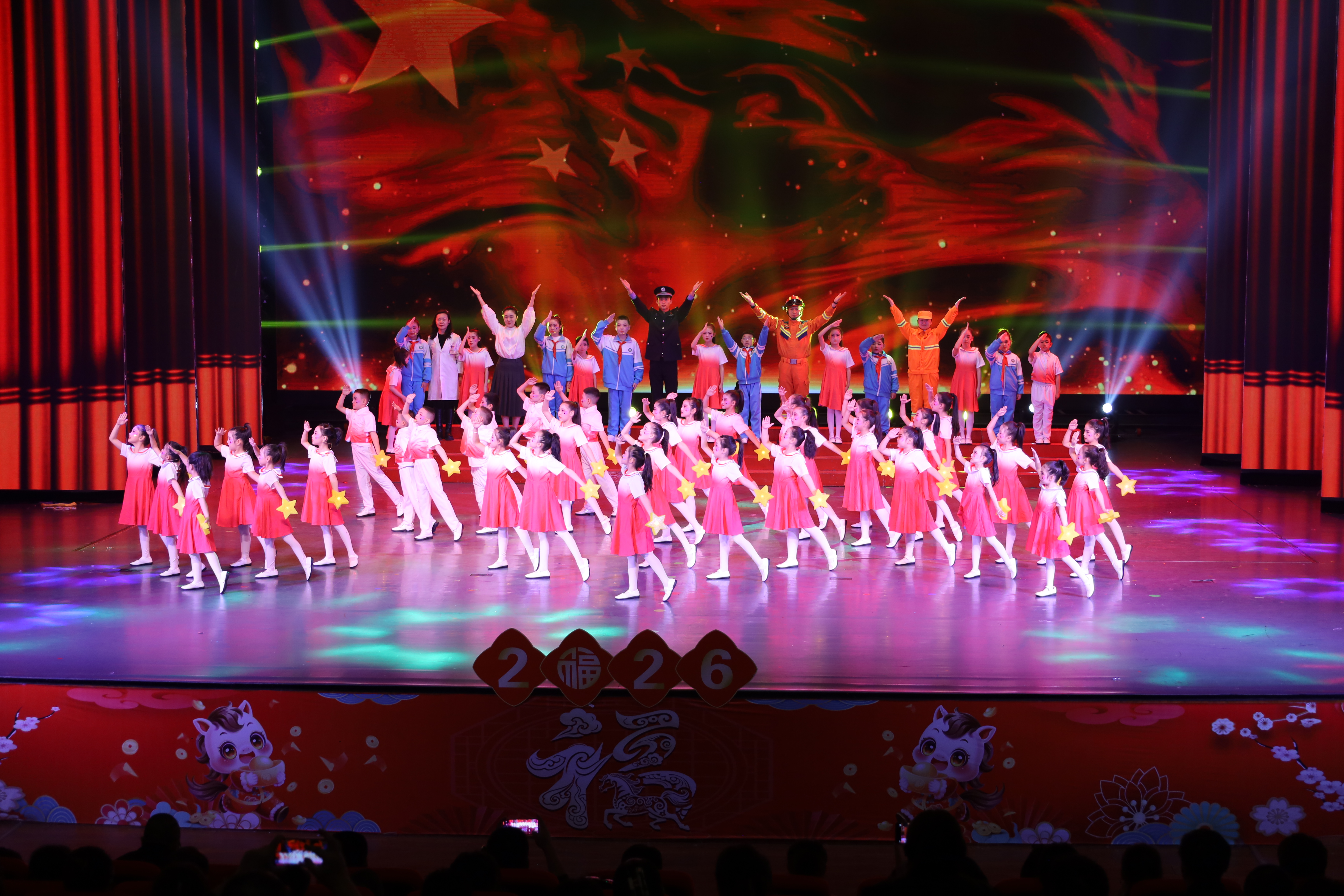 演出现场,现代元素与冰雪文化交相辉映,传统文化传承的脉络清晰可见。融合青花瓷、剪纸等非遗元素的儿童走秀古韵悠扬,气势磅礴的武术表演《龙舞九天》刚劲有力,让中华优秀传统文化在新时代校园舞台上焕发出勃勃生机。合唱《加尔加》《祖国有我》的旋律响起,清澈纯真的童声回荡在剧院,唱响了民族团结的动人乐章,传递出少年儿童对祖国母亲的深切热爱。