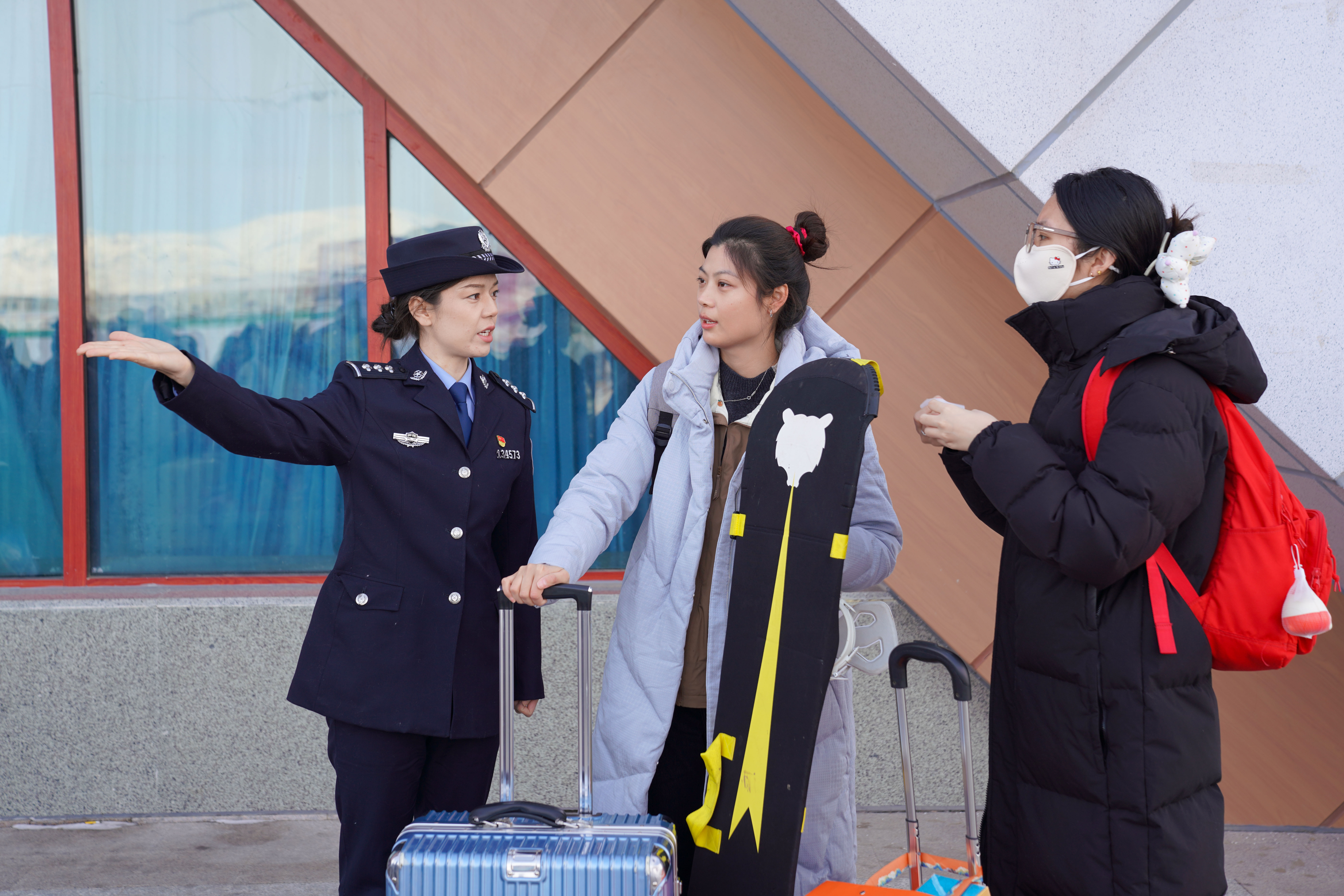 民警告知旅客前方有专车直达雪场。通讯员 张艳军摄