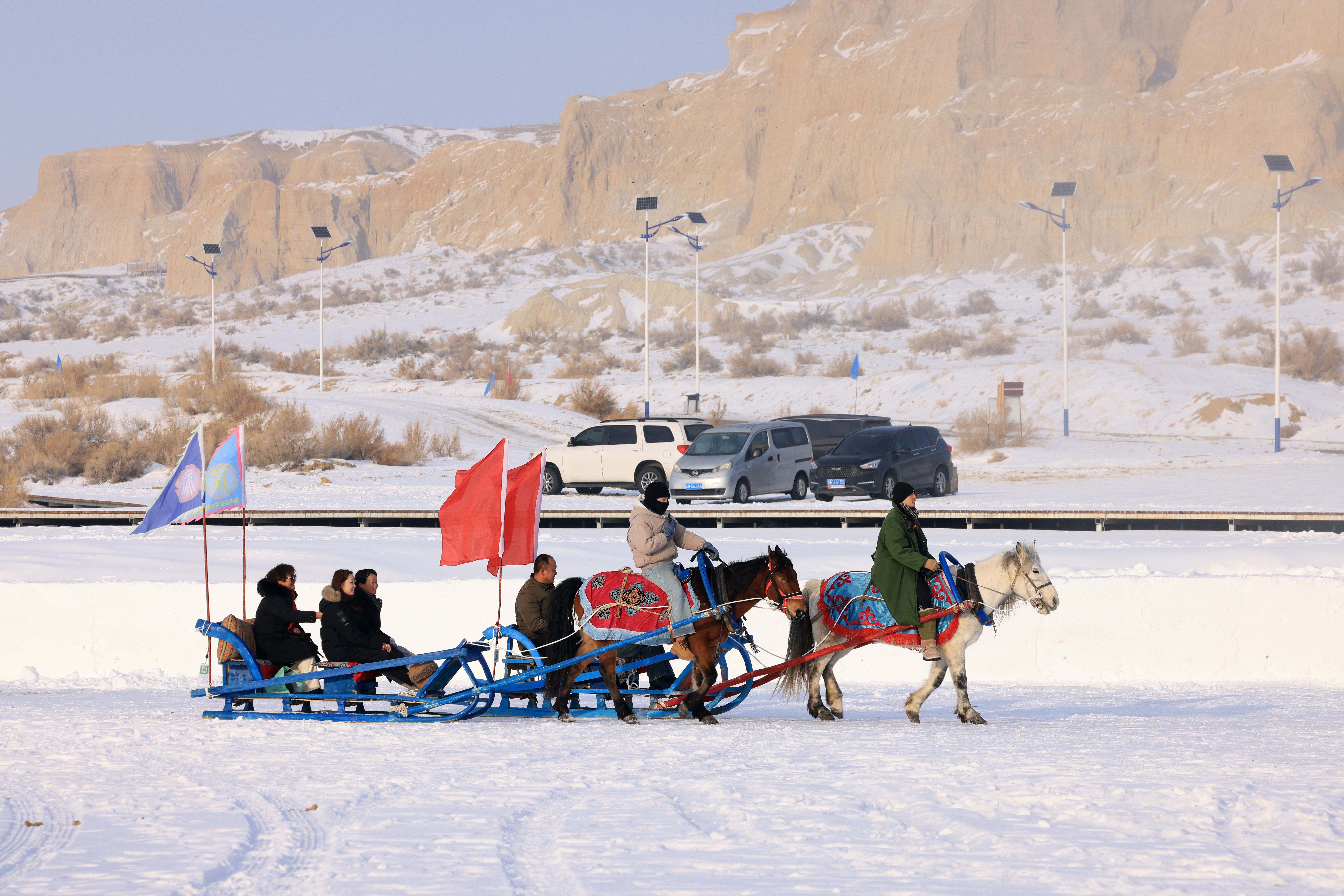 游客在福海县海上魔鬼城乘坐马爬犁。