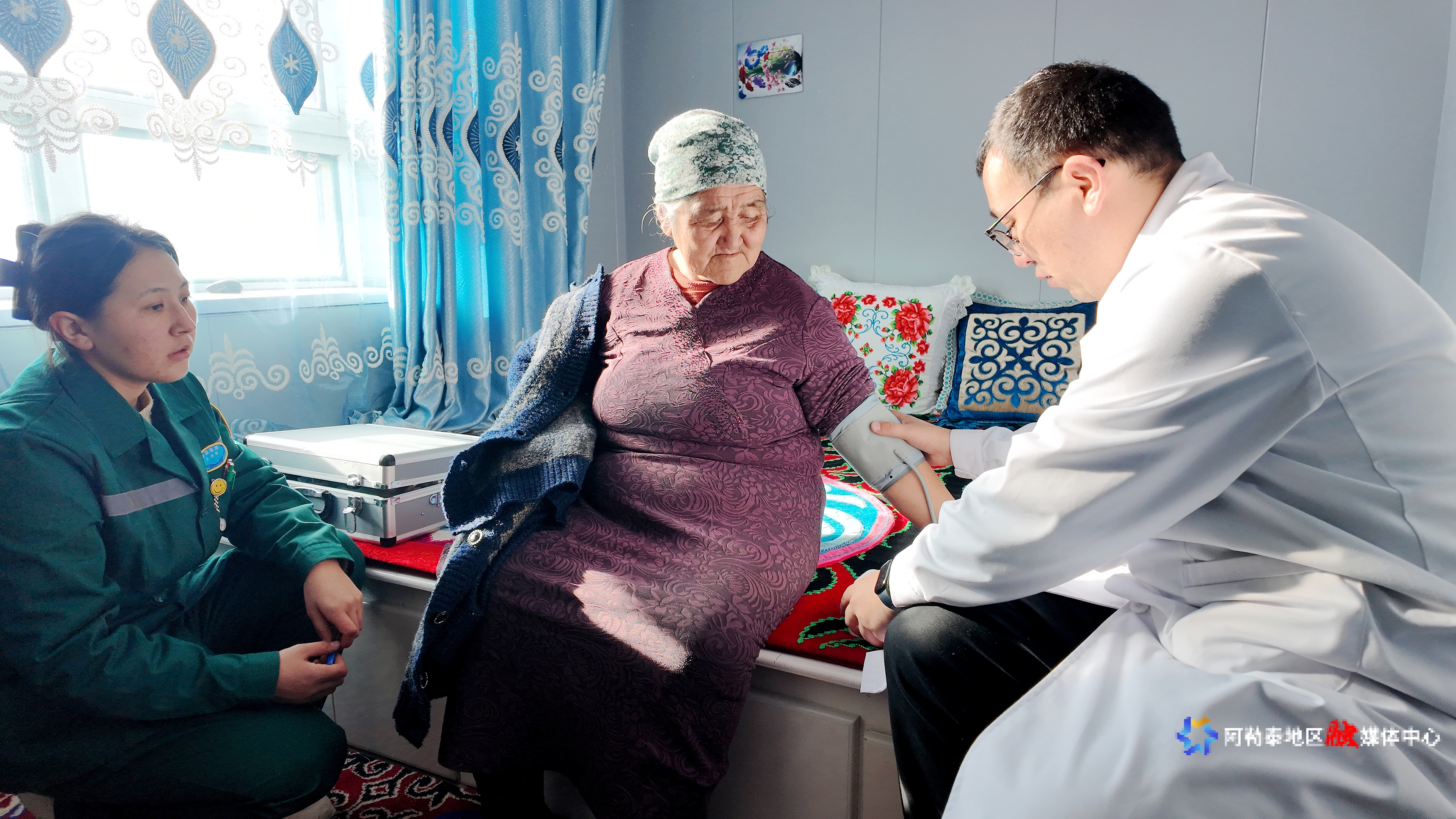 马得尼亚提·恰力甫汗是阿勒斯别克·谢尔亚孜的邻居,他的爱人前期因交通事故卧病在床,当天,吐尔洪乡中心卫生院的医护人员为其提供了血压测量、吸氧等护理服务。吐尔洪乡中心卫生院医生木合塔尔·哈依拉提说:“寒潮期间,我们为行动不便和慢性病患者提供上门服务,减少他们在低温下外出的不便。”
