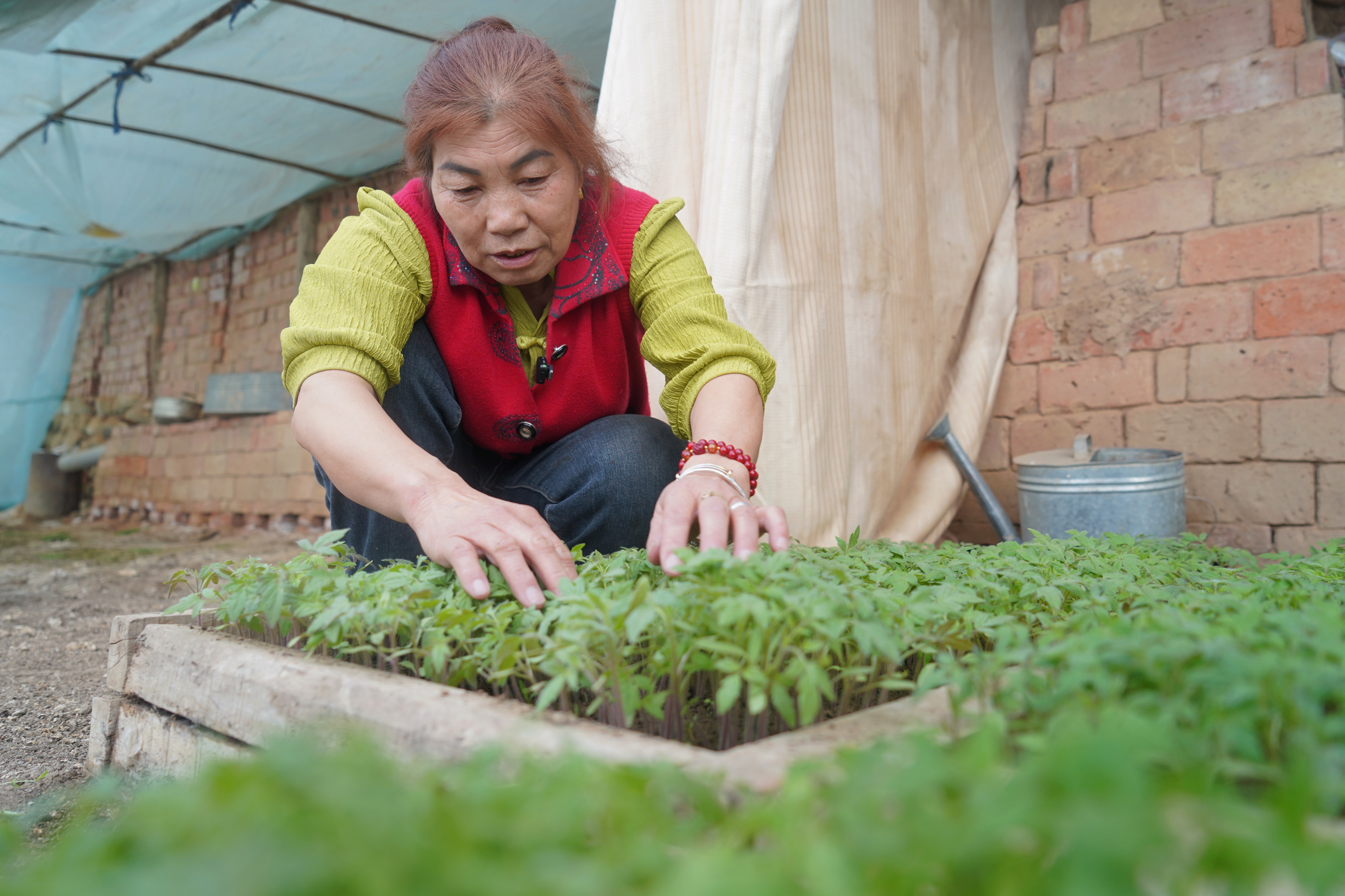 富蕴县喀拉通克镇克孜勒库都克村村民韩风花正在大棚育苗中。通讯员 阿吴英·哈得勒别克 摄