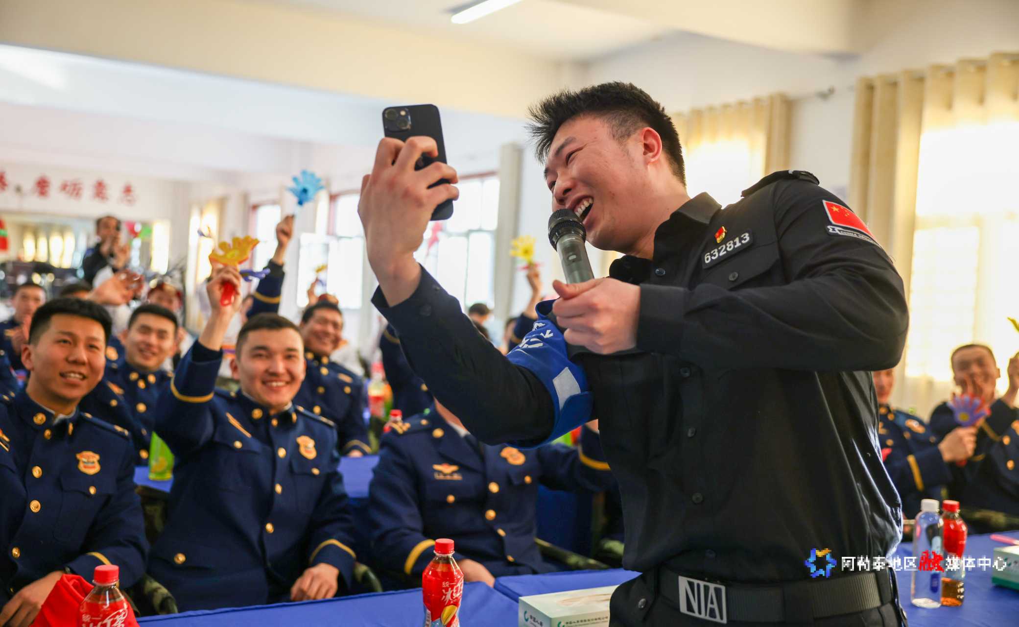 2月8日,在富蕴边境管理大队霍斯阿热勒边境警务室,队员们在演出间隙得知当天是民警金磊鑫的生日。他们默契地利用薯片、饮料、果冻等零食,快速制作了一个特别的生日蛋糕。在“击鼓传花”游戏中,这份惊喜被送到了金磊鑫手中。“没想到,你们给了我这么大一个惊喜!”他双手微颤地接过祝福,话音有些沙哑。