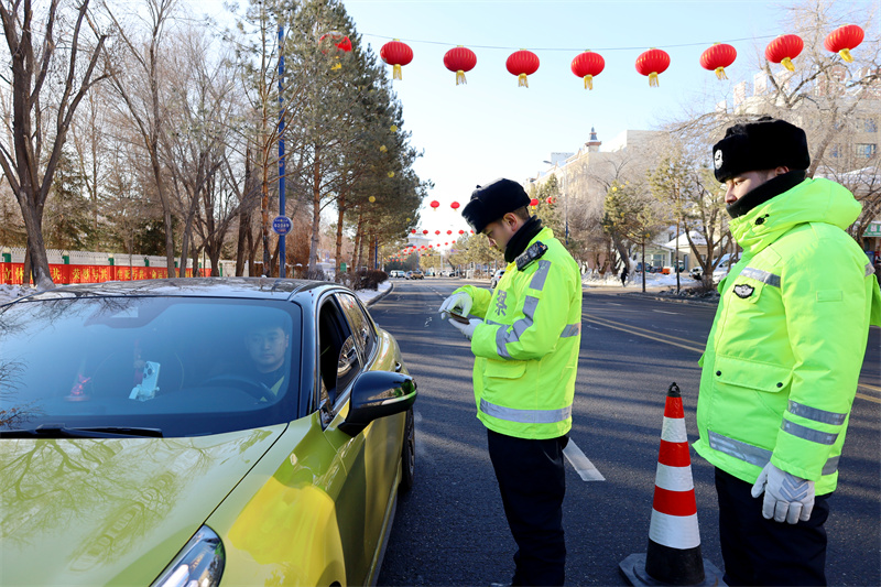 春运期间,交警在辖区路面开展执勤管控,护航道路通行。