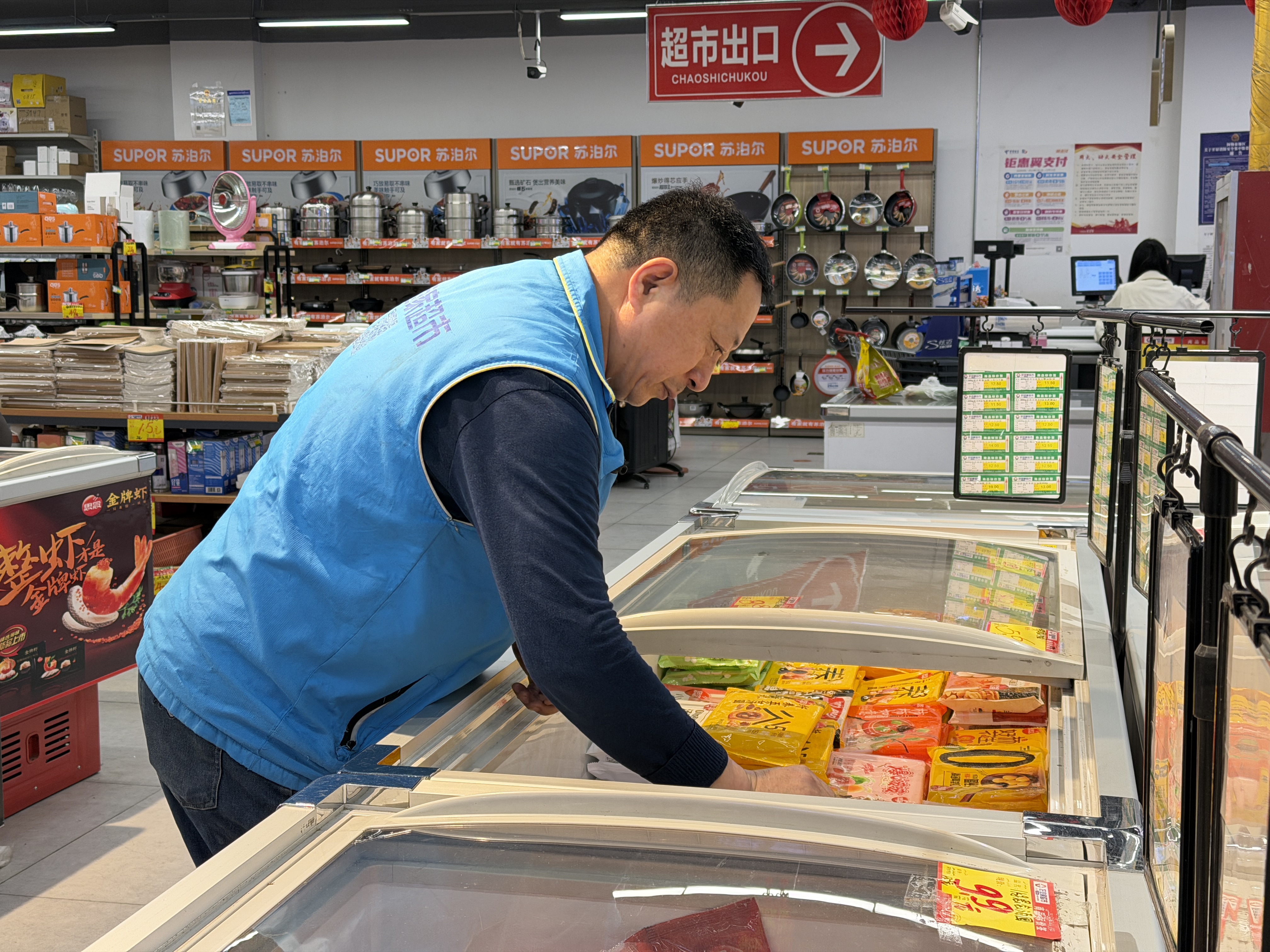 2月25日,阿勒泰市某超市工作人员正及时上货,确保节日期间货品供应充足、品类齐全。