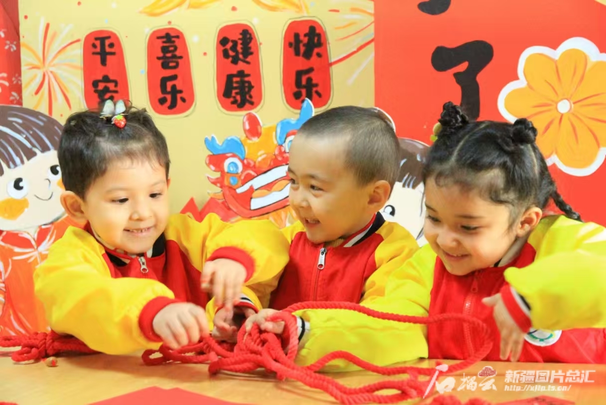2024年1月1日,喀什市乃则尔巴格镇中心幼儿园小朋友在迎新活动中了解中国结。谢文露 摄