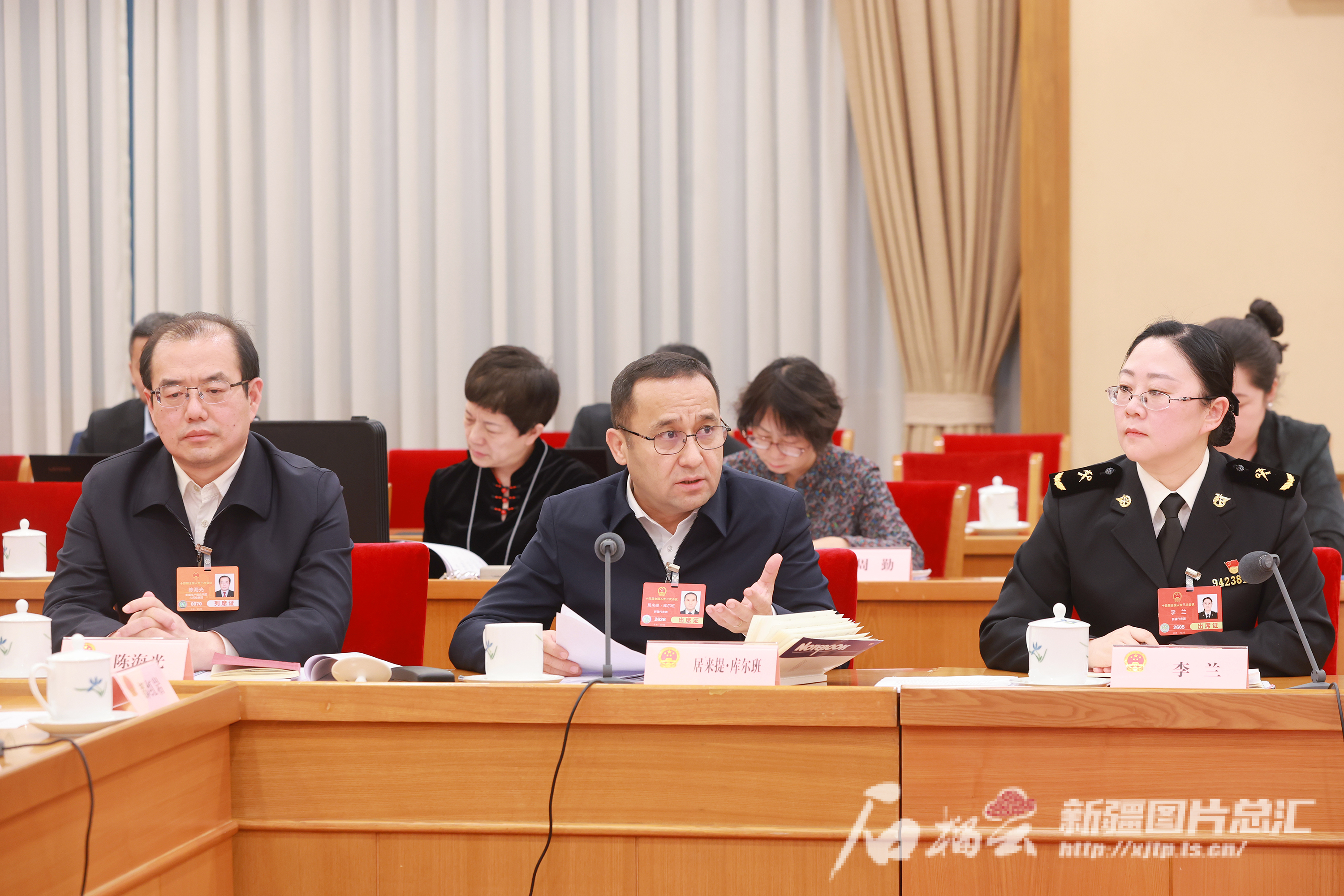 3月7日,参加十四届全国人大三次会议的新疆代表团审议全国人民代表大会和地方各级人民代表大会代表法修正草案。这是审议时居来提·库尔班代表(中)围绕促进代表积极履职、审计人才队伍建设等内容发言。天山网-新疆日报记者 崔志坚摄