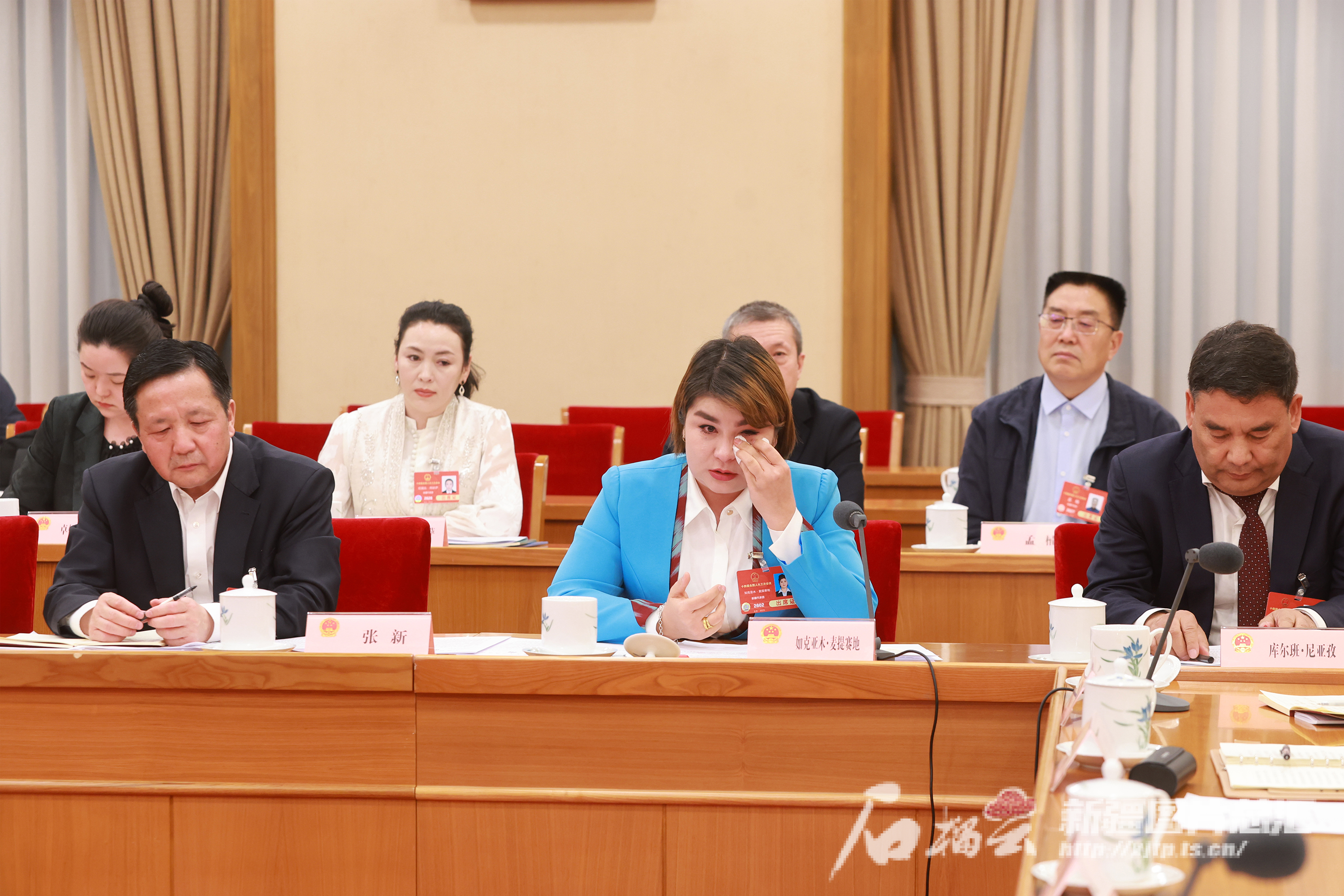 3月7日,参加十四届全国人大三次会议的新疆代表团审议全国人民代表大会和地方各级人民代表大会代表法修正草案。这是审议时如克亚木·麦提赛地代表(中)在发言时回忆起看望熊丽烈士家属情景时潸然泪下。天山网-新疆日报记者 崔志坚摄