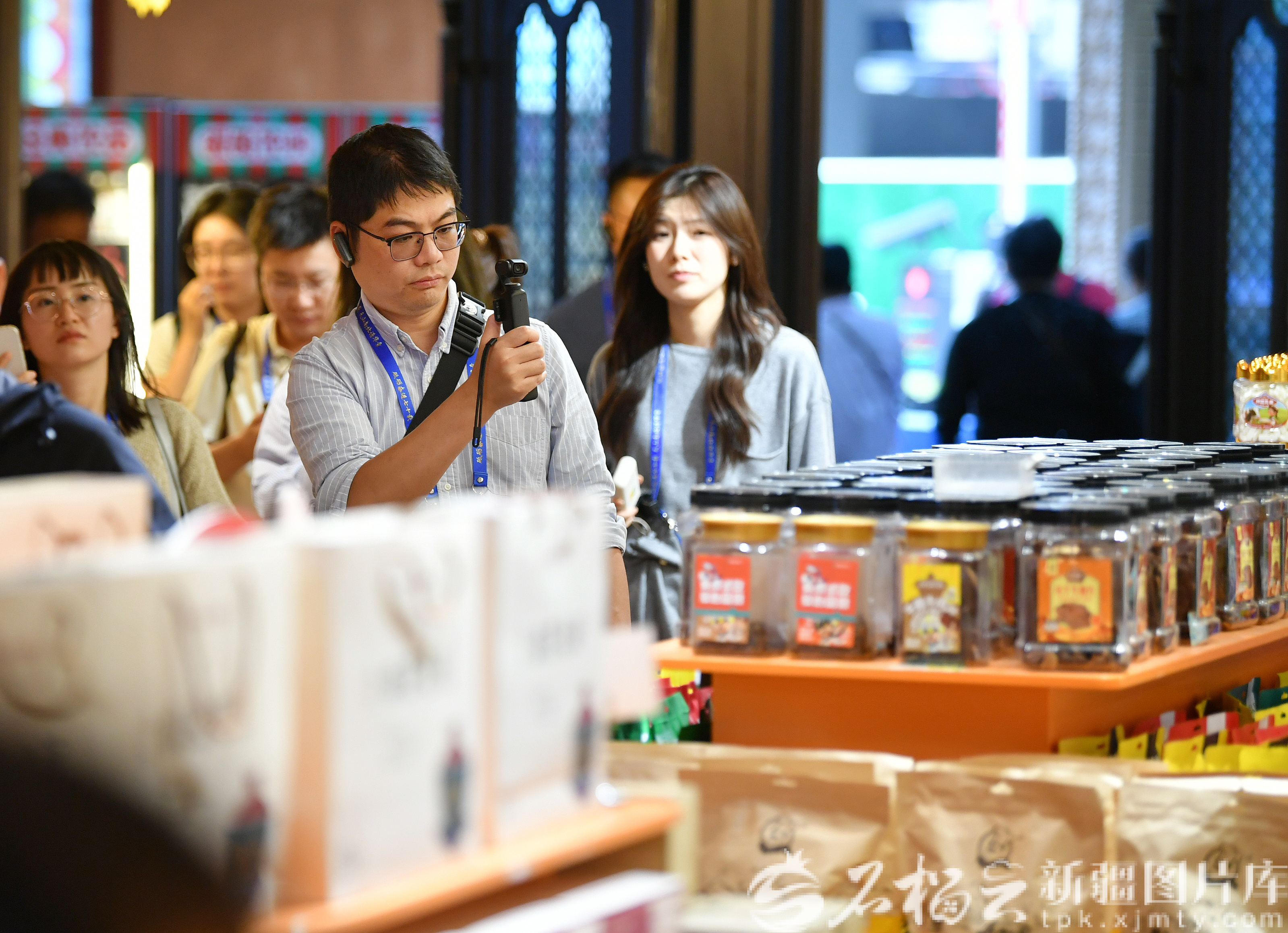 9月8日,采访团成员在新疆国际大巴扎拍摄各类旅游纪念品。