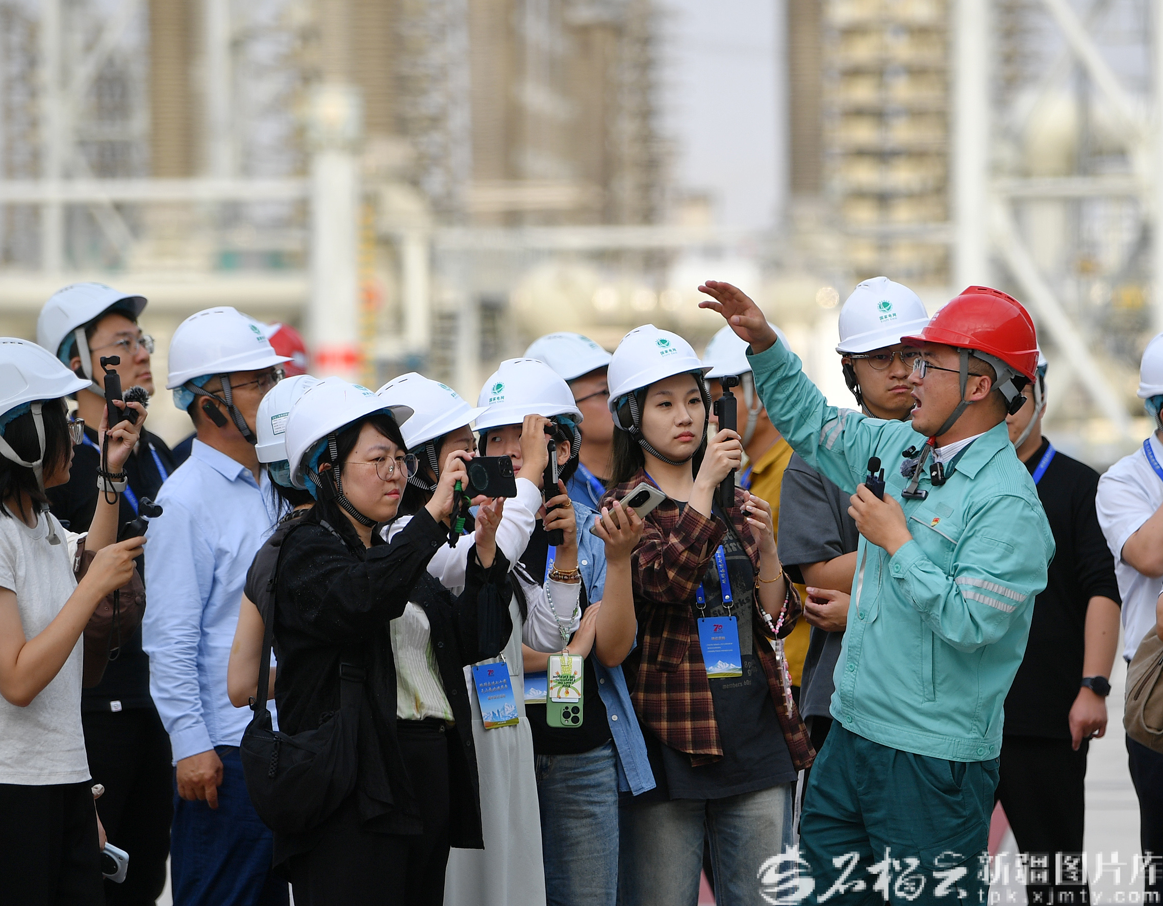 9月9日,昌吉—古泉±1100千伏特高压直流输电工程昌吉换流站站长王鸿(前右一)向采访团一行介绍运行情况。