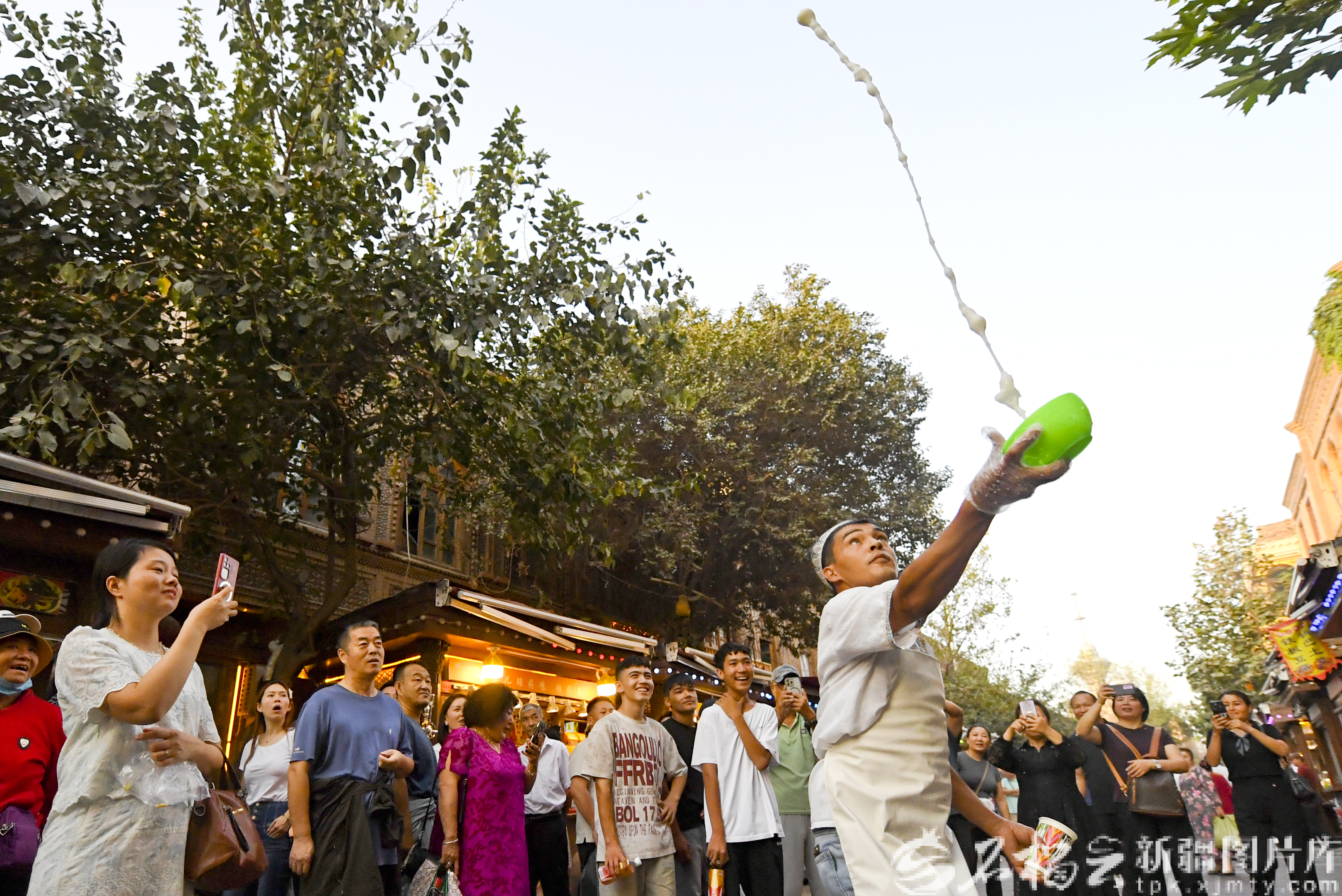 9月10日,游客在汗巴扎观看酸奶刨冰制作。