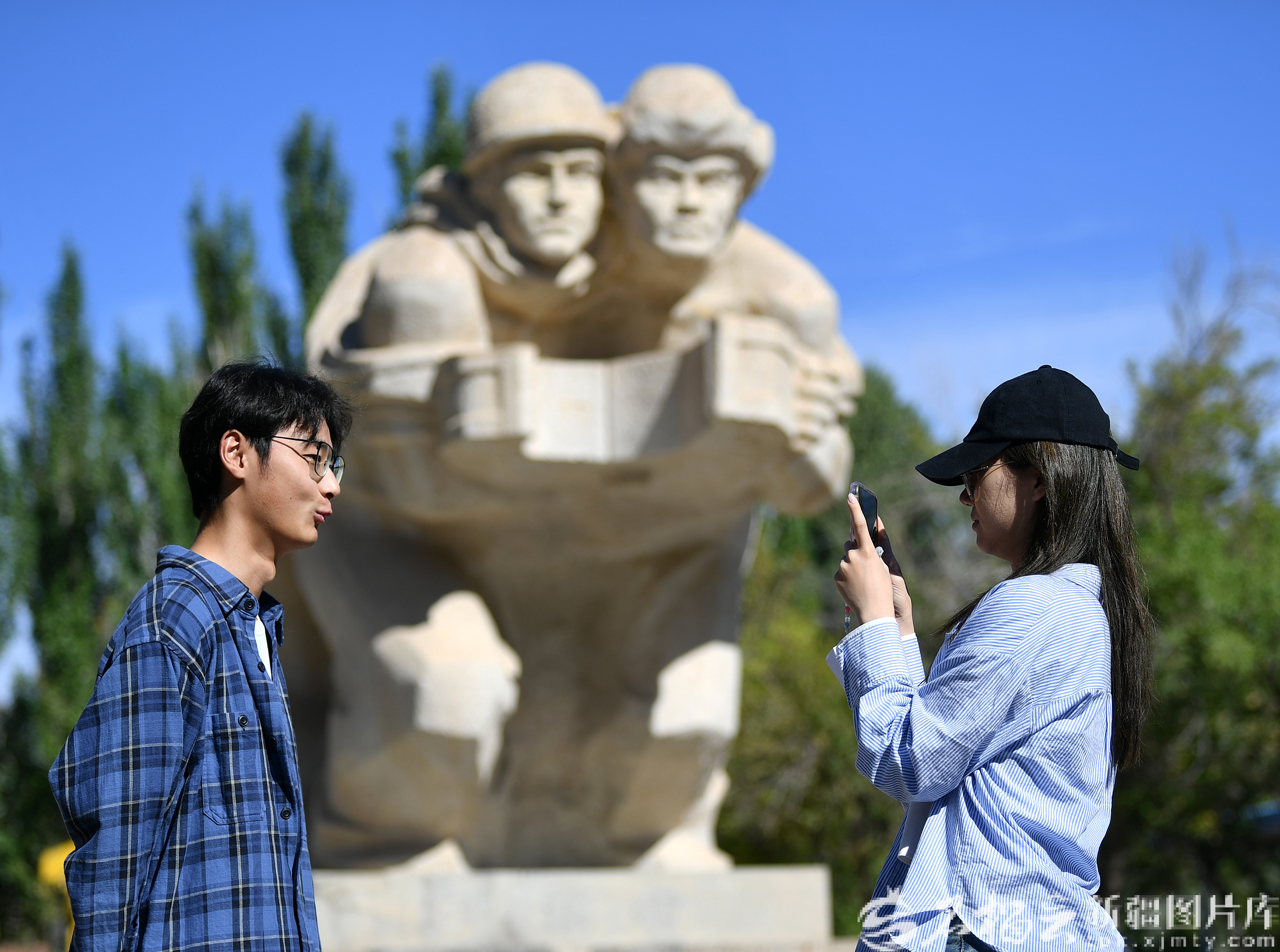 9月12日,采访团成员在克拉玛依市博物馆“开拓者”雕塑前采访中国石油大学(北京)克拉玛依校区学生。