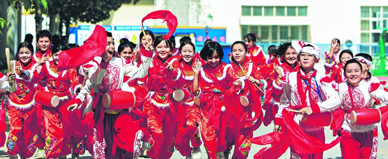 9月12日,阿图什市昆山育才学校的小学生在学习安塞腰鼓。该校开设了土陶制作、昆曲表演等课程,让学生在春风化雨中铸牢中华民族共同体意识。新华社记者程丽摄