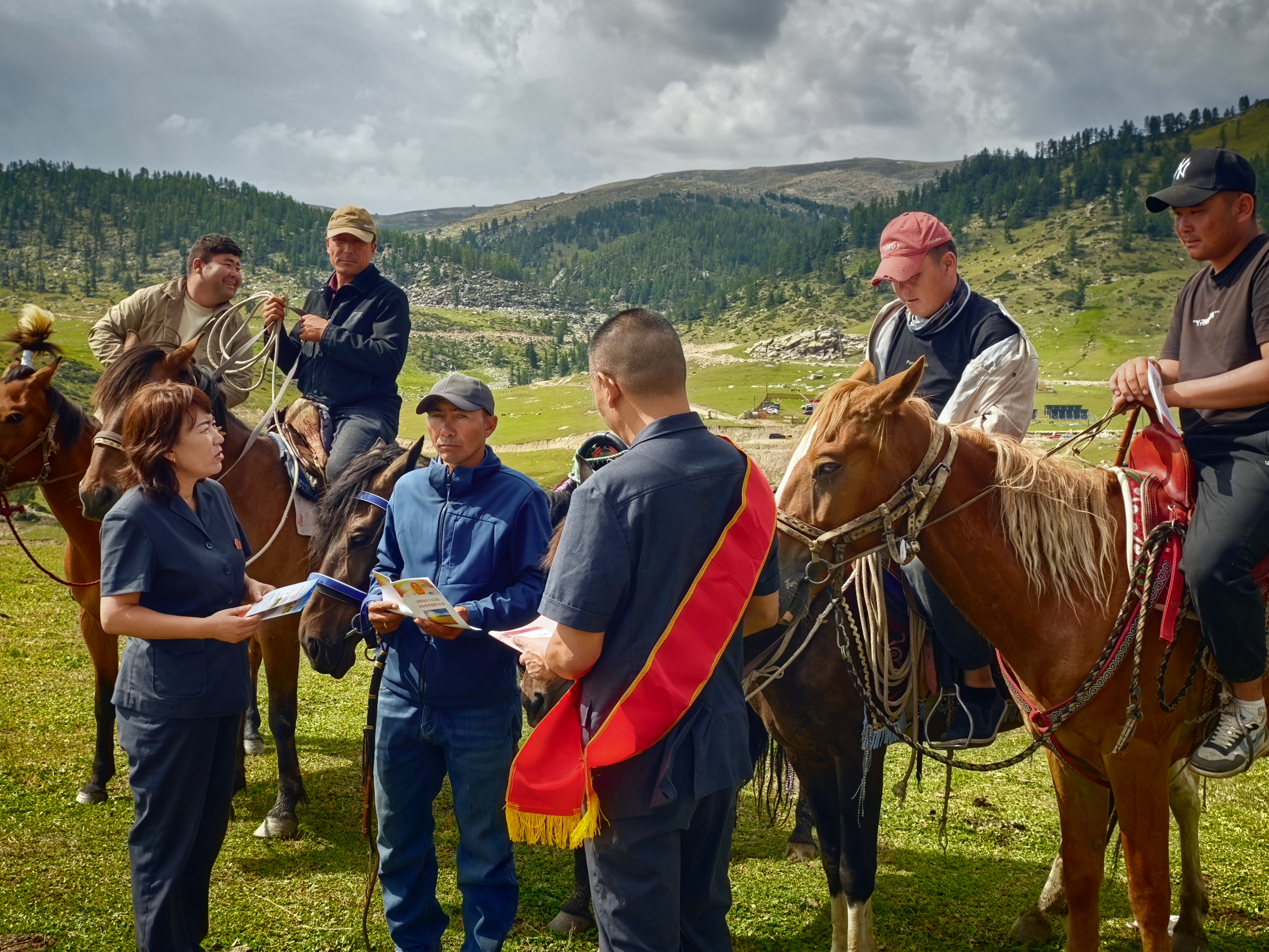 7月15日,阿勒泰市人民法院阿拉哈克人民法庭庭长热依扎·马迪汗(左一)和同事在牧区开展法治宣传。石榴云/新疆法治报记者 齐琪摄