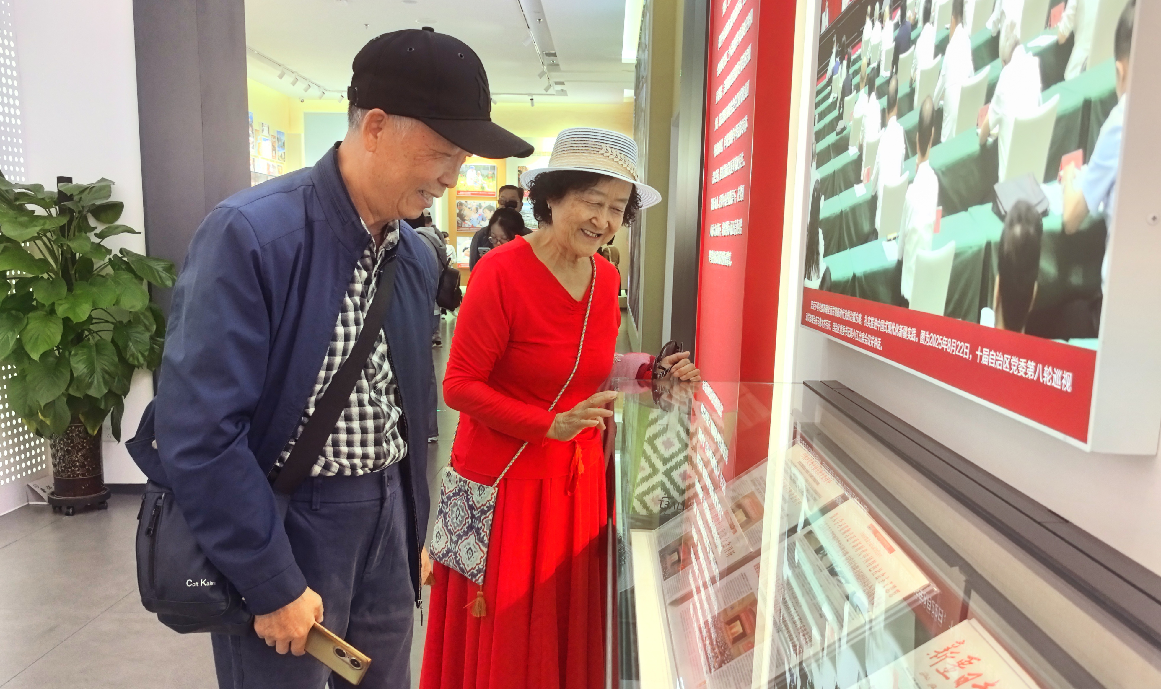 在兰新高铁开通运行的照片前,退休干部黄书伴伫立良久,目光紧紧定格在画面上,眼角渐渐泛起泪光。“走进展厅,处处是感动,时时受鼓舞,好多场景都让我忍不住热泪盈眶。”曾在新疆扎根工作14年的他,语气里满是激动,“这次展览把自治区成立70年的变迁,尤其是新时代以来经济社会的历史性跨越、天山南北的翻天覆地变化都呈现在眼前,看着这些,心里既骄傲又温暖。”