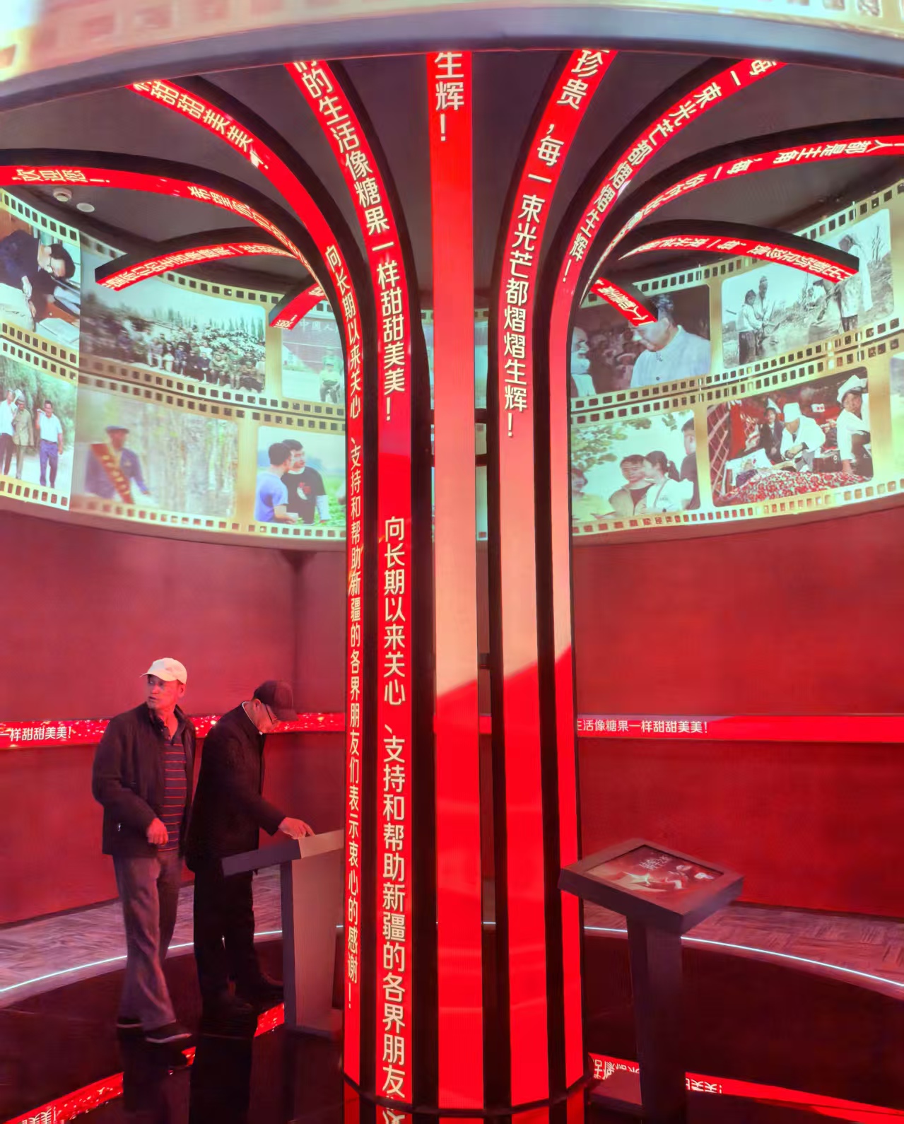 展览特别设置的时光“传送机”墙面,通过32组新旧对比影像,不仅展现了新疆地理风貌的巨变,更彰显了发展理念的升华——基础设施跨越发展、特色产业拔节生长、民族团结之花常开、文化遗产活态传承。这种肉眼可见的蜕变,让每一位观众都能触摸到发展的温度,感受到这片土地的蓬勃生机。