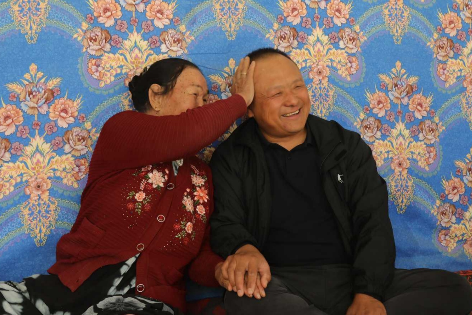 10月6日,尉犁县阿克苏普乡英巴格村,且力皮汗·沙衣提(左)开心地摸着前来陪她过中秋的孙林的头。陈虹宇摄
