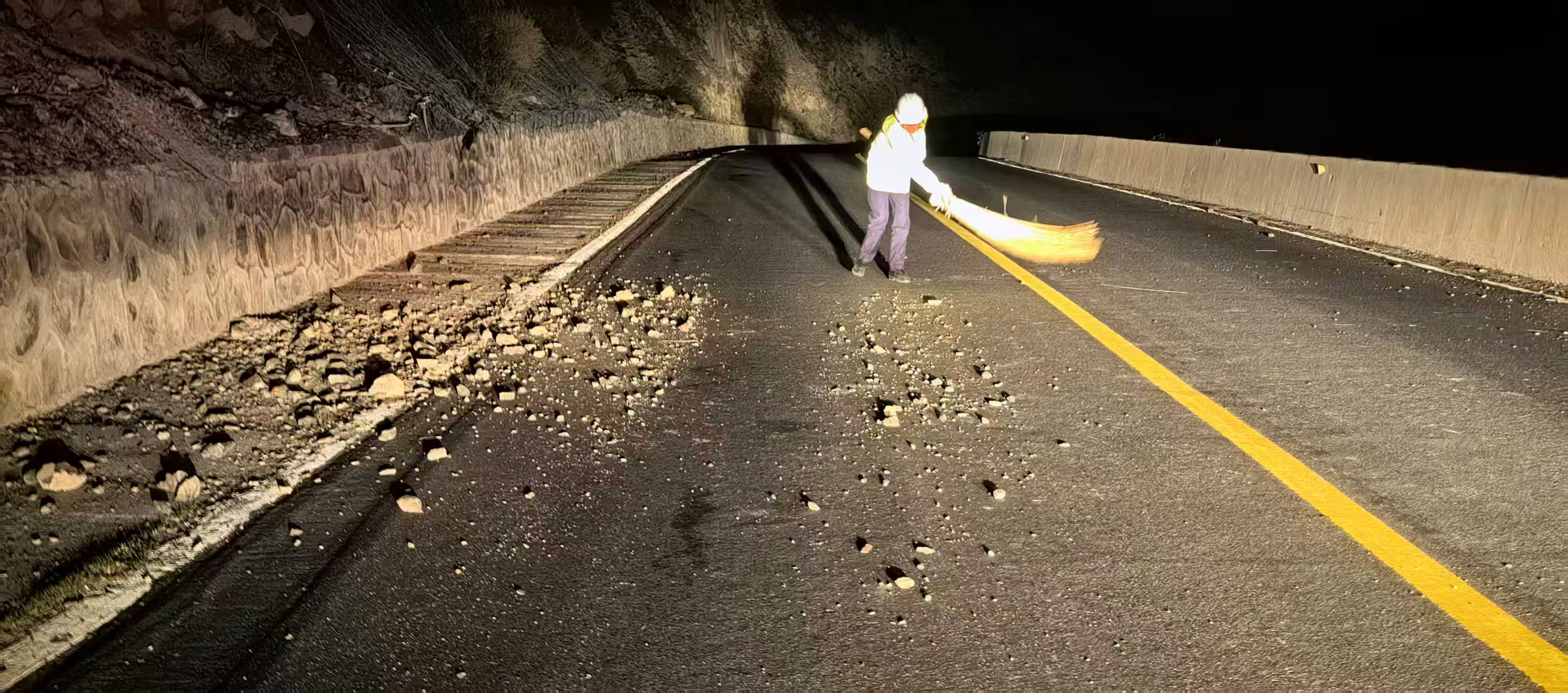 9月30日7时许,辅警叶斯哈提巡逻至哈希勒根达坂附近,发现几块拳头大的落石横在路面。他立即下车,从巡逻车上取出工具,将落石扫到路边沟里。