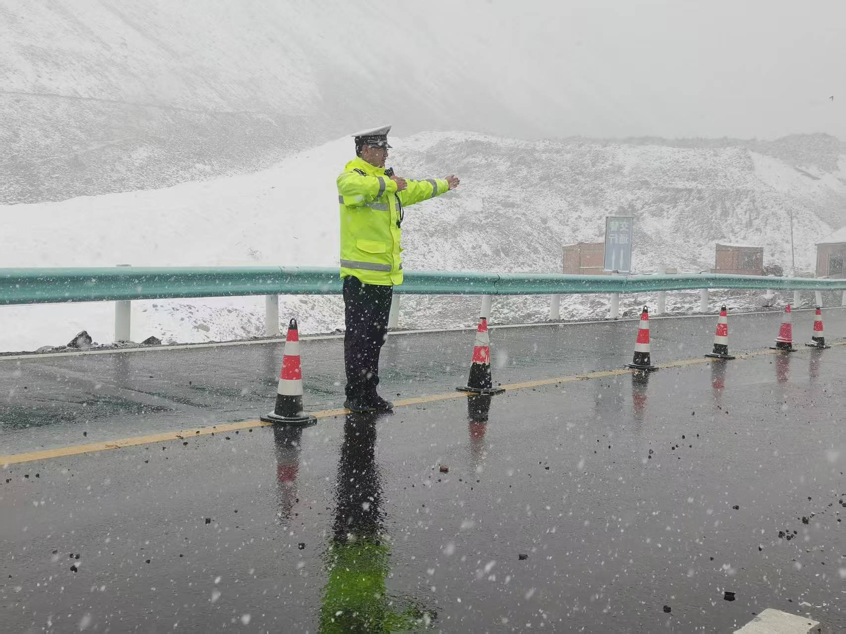 8月,一场大雪突袭独库公路,哈希勒根达坂瞬间被白雪覆盖,路面湿滑难行,车辆通行受阻。民警王小磊和同事们顶风冒雪,在积雪路段摆放警示锥。雪花落在荧光绿的雨衣上迅速结冰,王小磊手指冻得发僵,仍坚持准确地做出每一个交通手势。游客小林回忆:“风雪里的交警像座灯塔,跟着他们的手势慢慢开,心里特别踏实。”