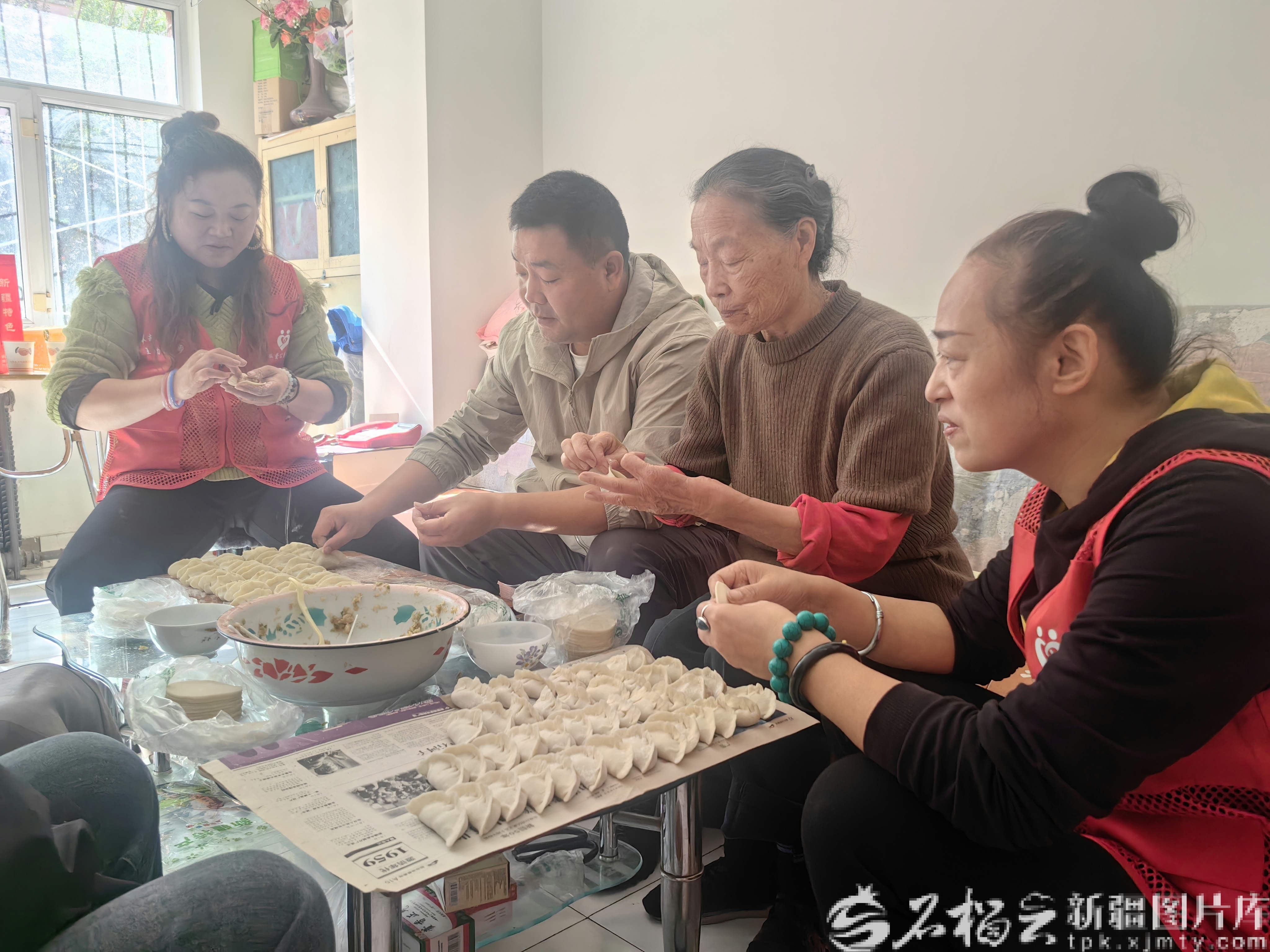 10月6日,乌鲁木齐市青年志愿服务协会志愿者和老人一起包饺子。马珉摄