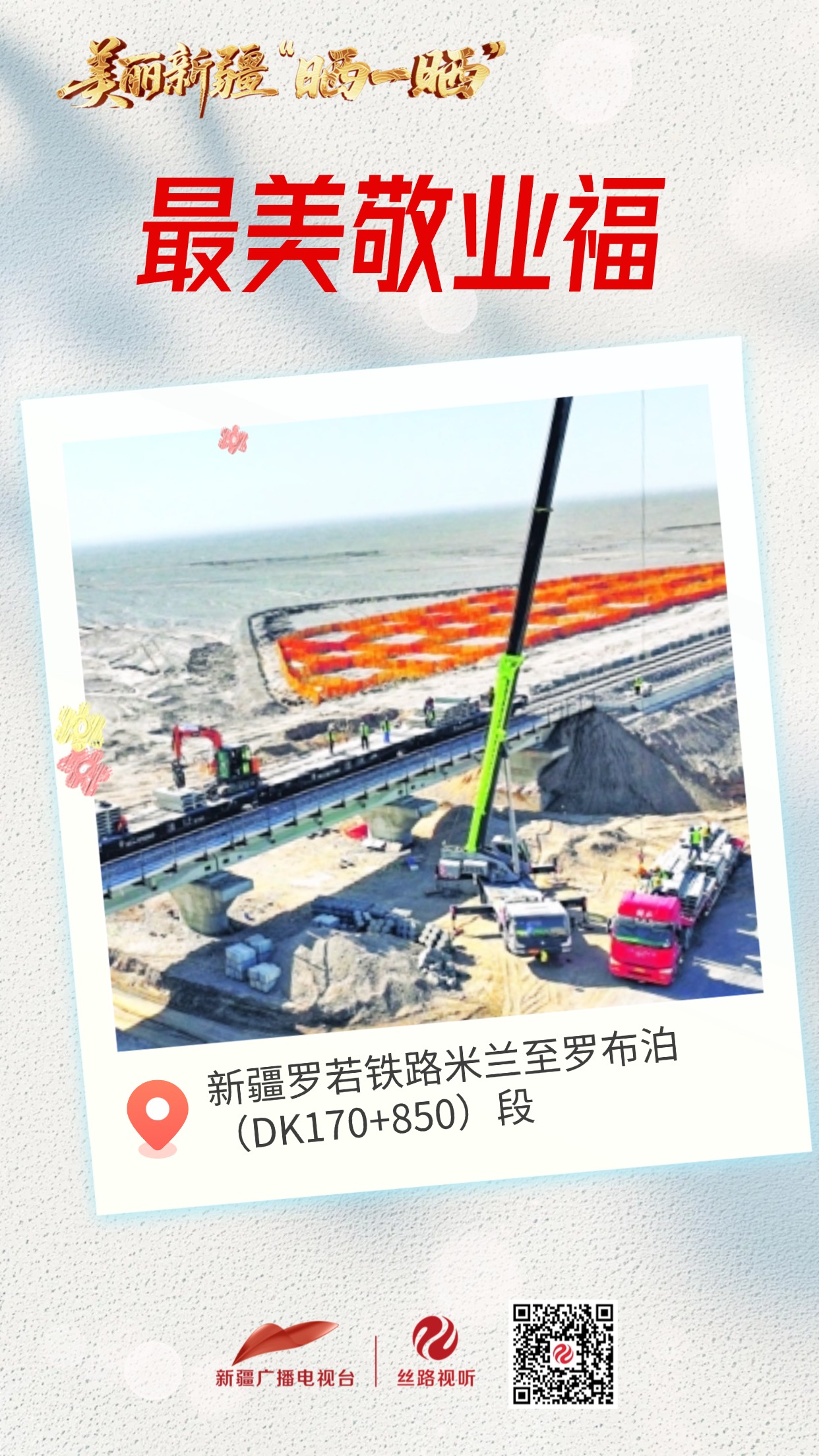 铁路铺轨现场:中铁一局建设者国庆期间抢抓进度,铁轨延伸向戈壁深处,为丝路物流织密网络。工人在罗若铁路米兰至罗布泊(DK170+850)段进行铺轨作业。