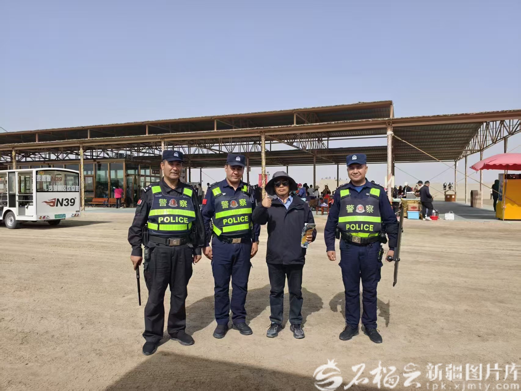 10月5日,黑龙江游客梁先生与麦盖提县公安局库木库萨尔乡派出所N39°沙漠旅游景区警务室民警辅警合影。麦盖提县公安局供图