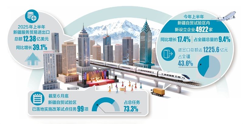 截至6月底,新疆自贸试验区已落地实施改革试点任务99项,占总任务的73.3%。今年上半年,新疆自贸试验区内新设立企业4922家,同比增长17.4%,占全疆总量的9.4%;进出口总额达1225.6亿元,占全疆43.6%,一系列数据印证了新疆自贸试验区作为“改革开放试验田”的强大吸引力。