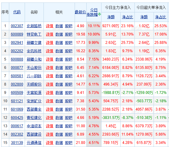 板块个股中,北新路桥、特变电工、新疆交建涨停,金风科技、新疆众和、天山股份等9只股票涨超5%。