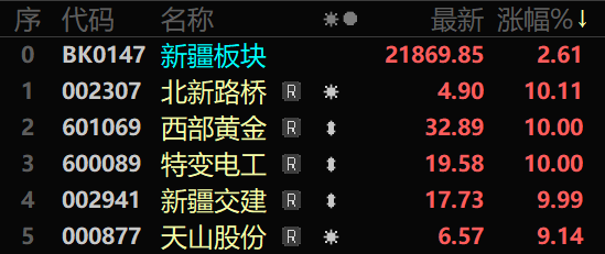 今日,北新路桥上涨10.11%,报收4.90元;西部黄金上涨10.00%,报收32.89元;特变电工上涨10.00%,报收19.58元;新疆交建上涨9.99%,报收17.73元;天山股份上涨9.14%,报收6.57元。博纳影业、西域旅游、*ST中基、汇嘉时代、天康生物跌幅居前。
