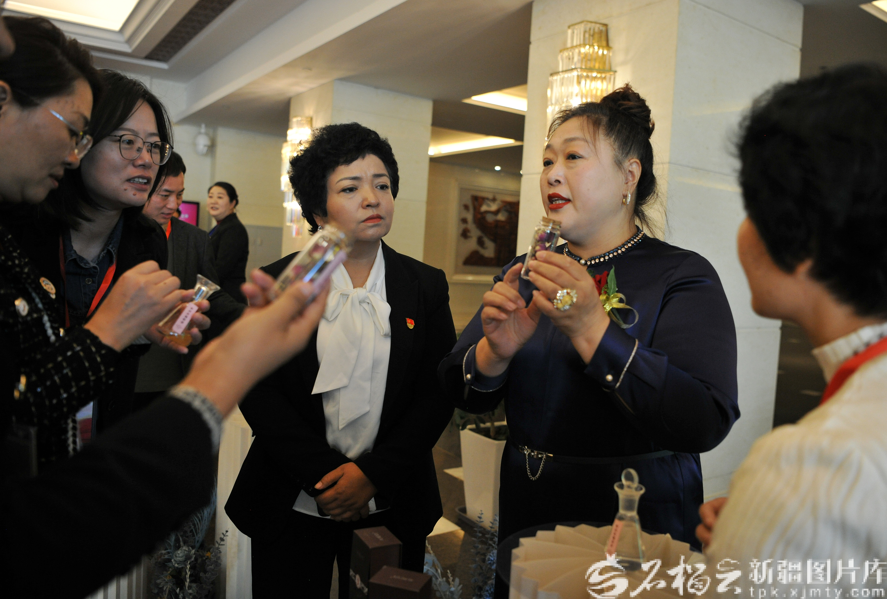 10月10日,新疆和田阳光沙漠玫瑰有限公司董事长刘天志(右二)向参会代表介绍该公司生产的化妆品。天山网-新疆日报记者 秦梅花摄