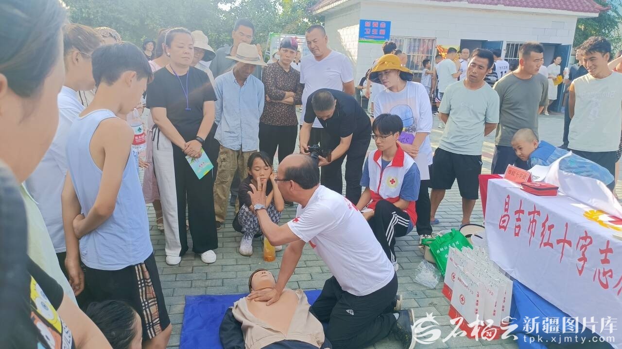 7月5日,昌吉市红十字会组织志愿者赴昌吉市二六工镇开展应急救护技能普及宣传活动。肖金鹏摄