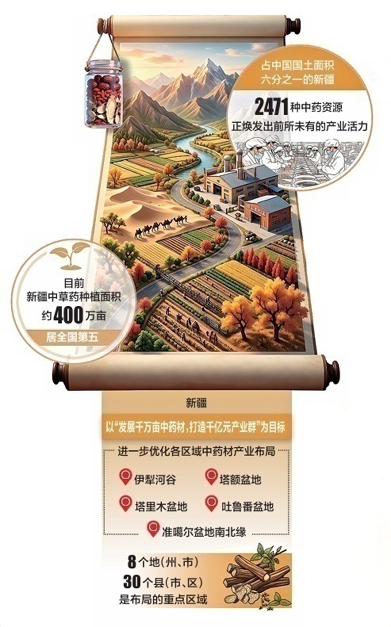近年来,新疆以全产业链思维一体推进,从标准化种植到品牌化营销,从精深加工到融合创新,一个集种植、加工、交易、研发、应用于一体的现代中药产业体系正加速形成,带动了中医药产业高质量发展,促进了乡村全面振兴和农民增收。