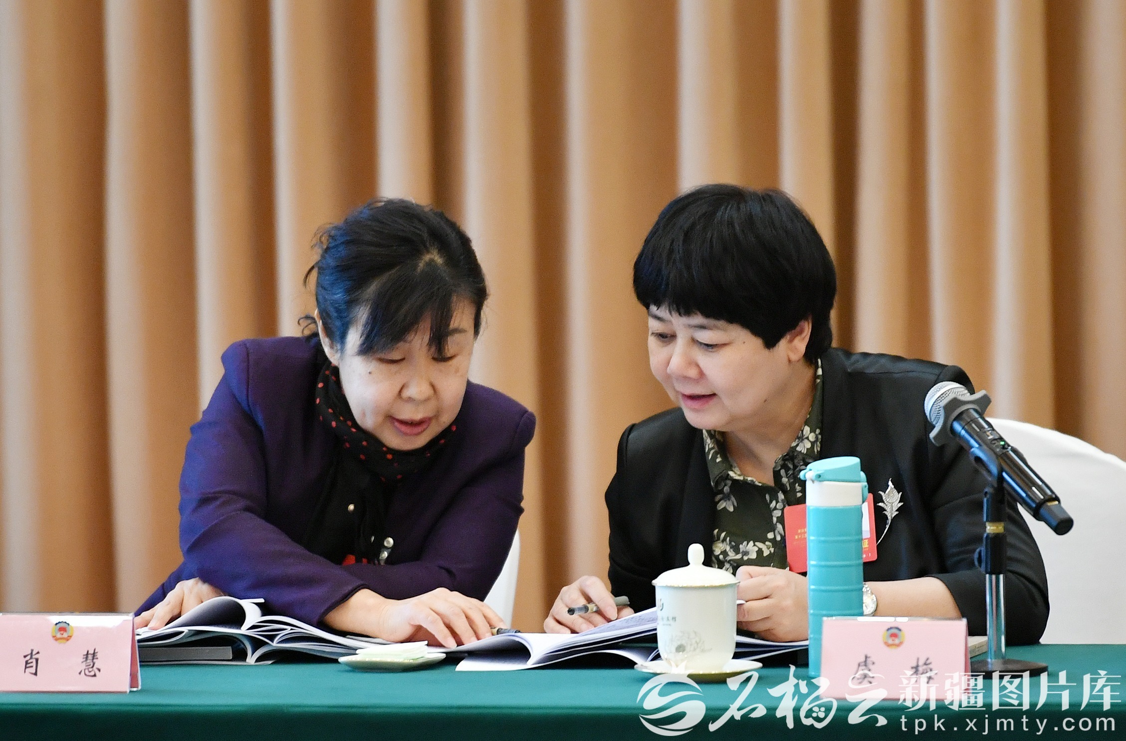 1月27日,少数民族界、宗教界委员分组讨论政府工作报告、自治区“十五五”规划纲要草案、计划草案报告和预算草案报告时,肖慧委员(左)和虞梅委员在会议间隙交流。石榴云/新疆日报记者 邹懿摄