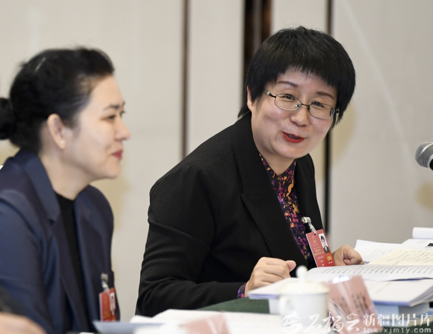 1月29日,高红妮(右)参加乌鲁木齐市代表团审议时发言。图片由本人提供